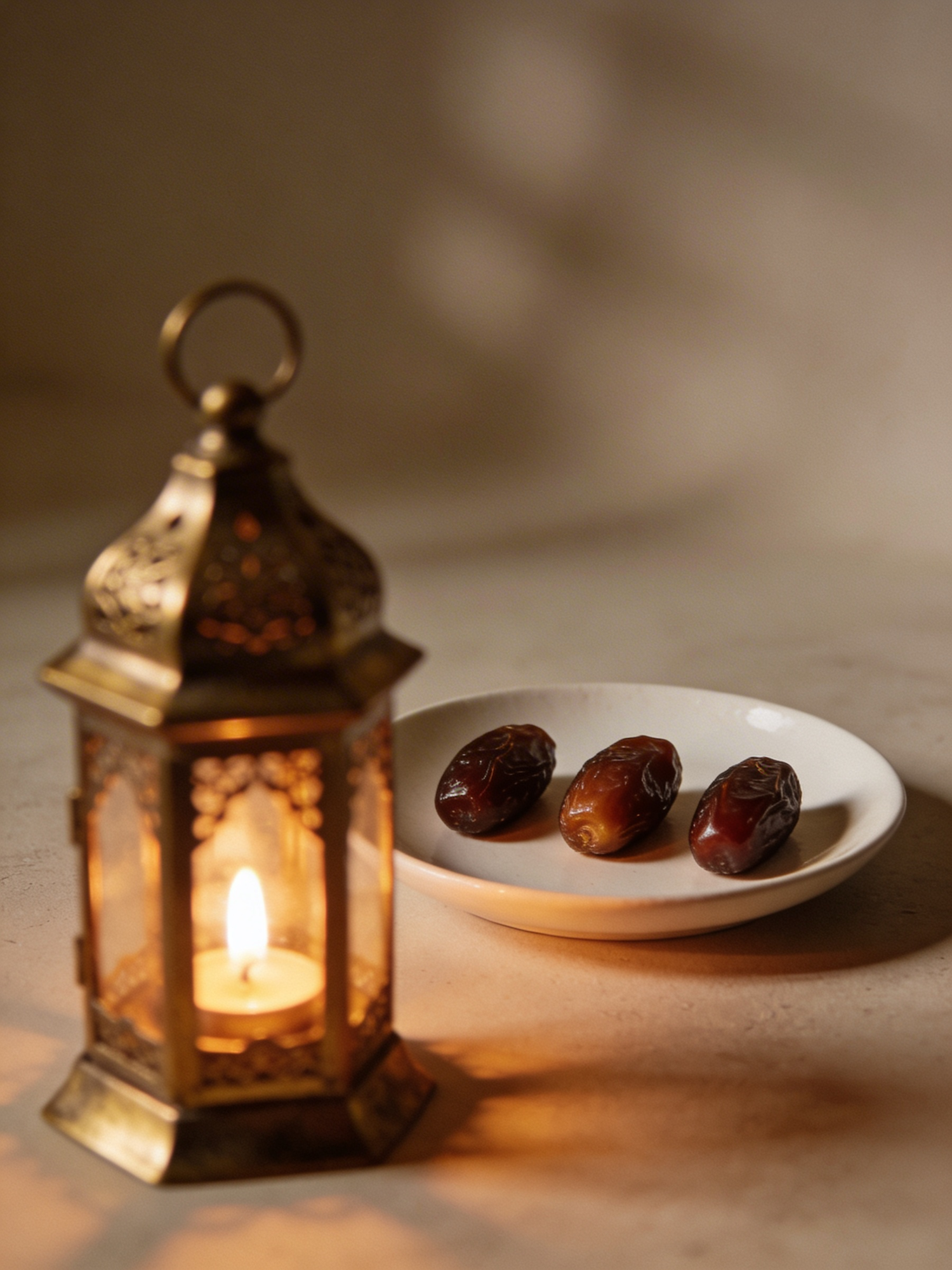A high‑definition Ramadan editorial scene. A small brass lantern emits a soft warm glow beside a simple ceramic plate holding three dates arranged with precision. The background is neutral and uncluttered, with soft shadows and a calm, atmospheric feel. No text, no logos.