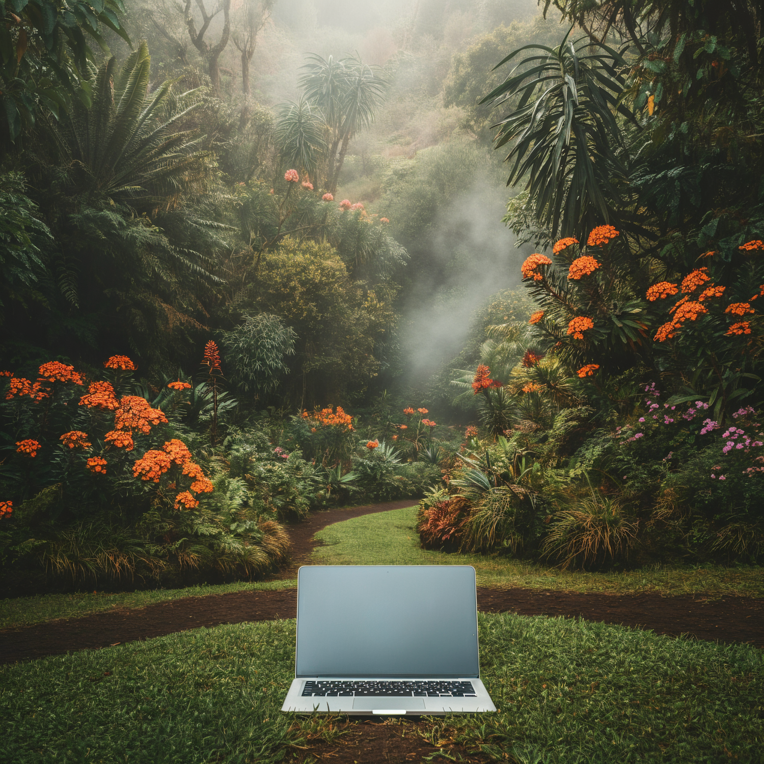 A laptop sits on a vibrant green lawn surrounded by tropical plants and colorful flowers in a foggy, serene forest scene.