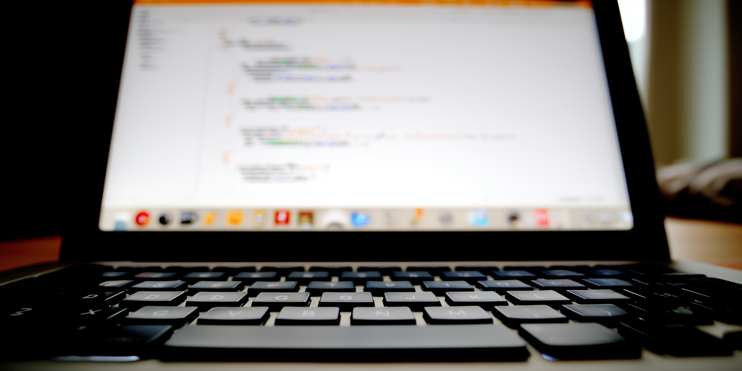 Close-up of a laptop keyboard with a blurred screen showing code, perfect for illustrating programming or tech-related themes.