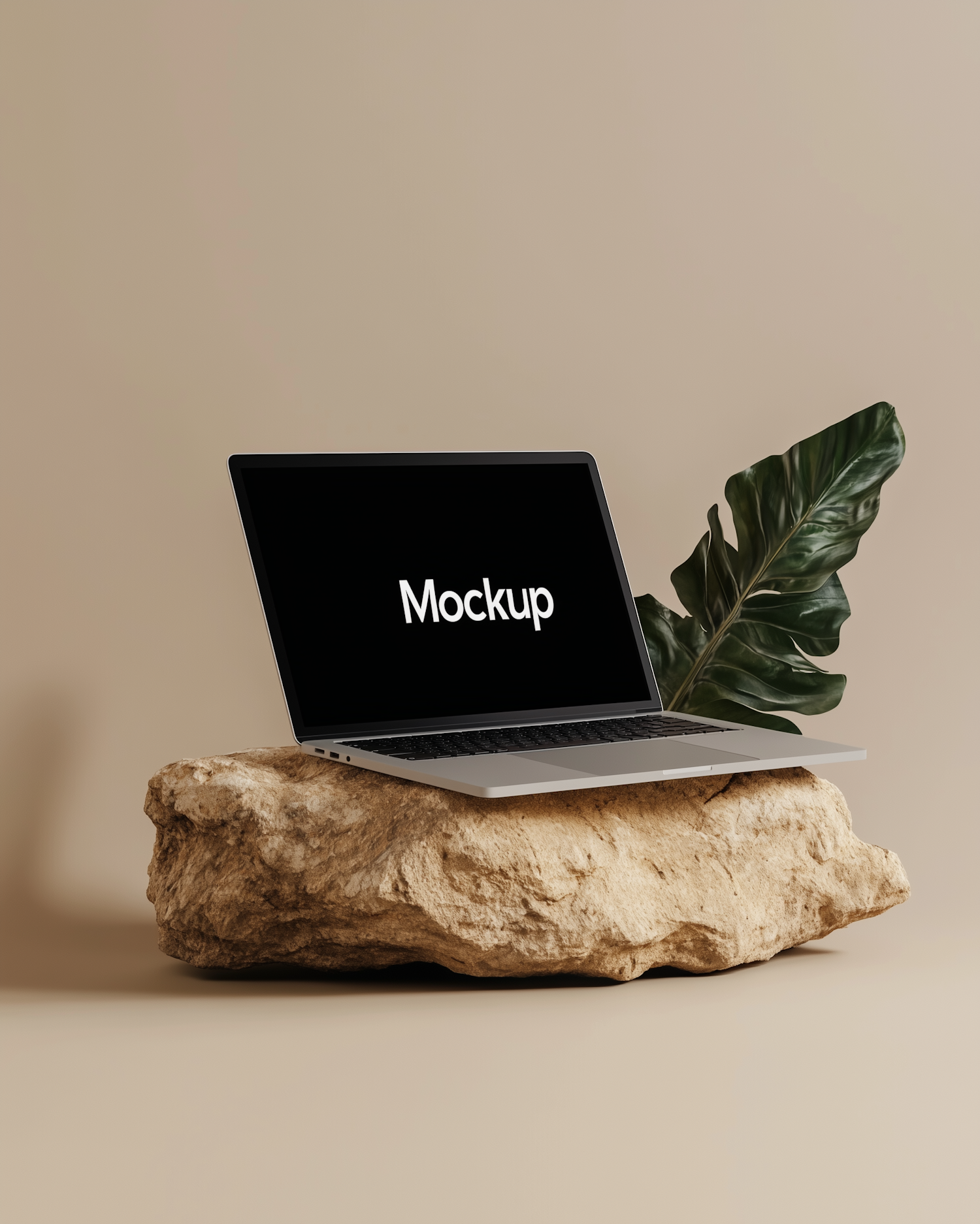 Minimalist laptop mockup on a beige rock with a green monstera leaf, blending modern tech with natural aesthetics.