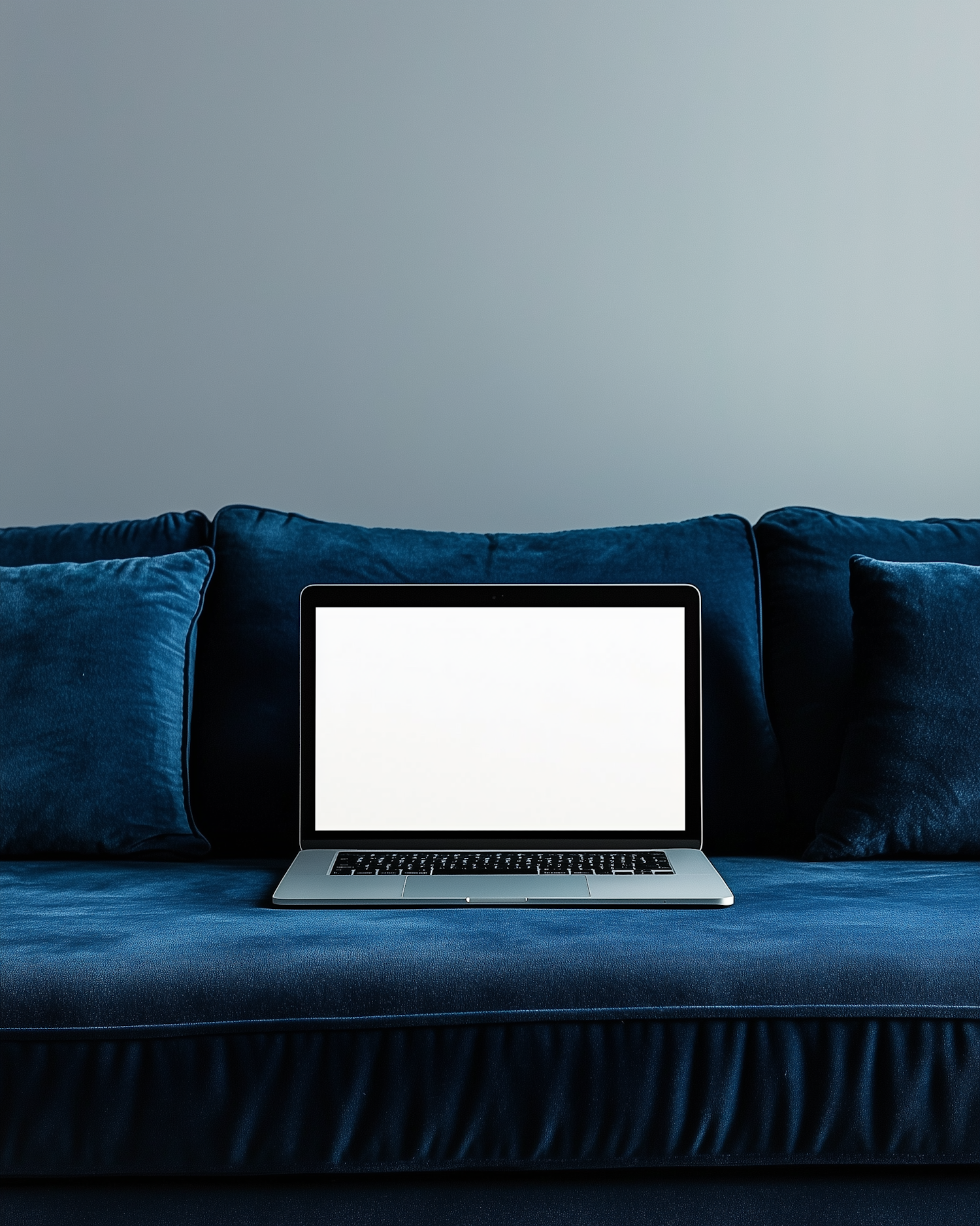 Minimalist setup with a laptop on a plush blue velvet sofa against a light gray wall. Perfect for work-from-home inspiration.