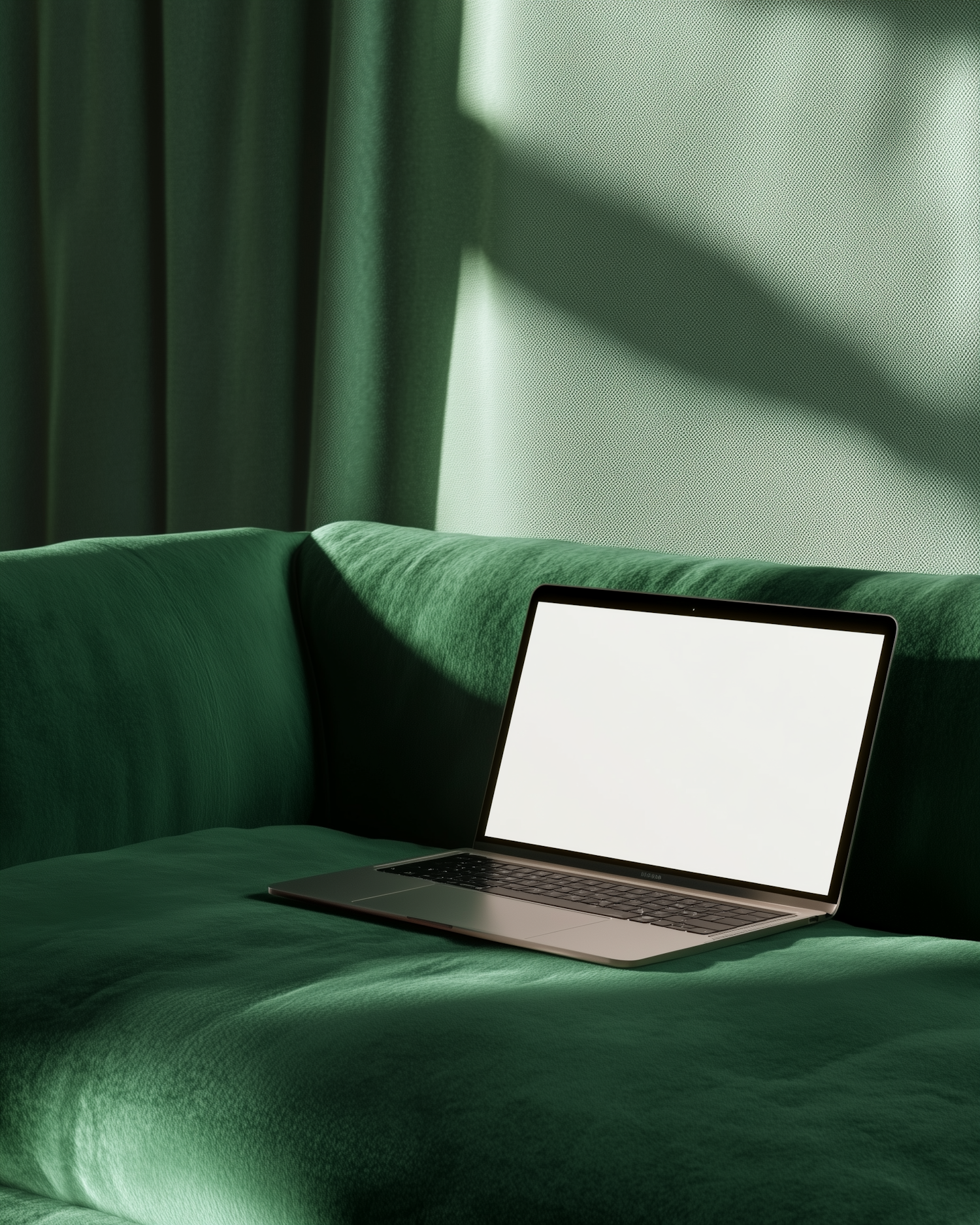 Minimalist setup with a laptop on a green velvet sofa, bathed in soft sunlight. Perfect for work-from-home inspiration.