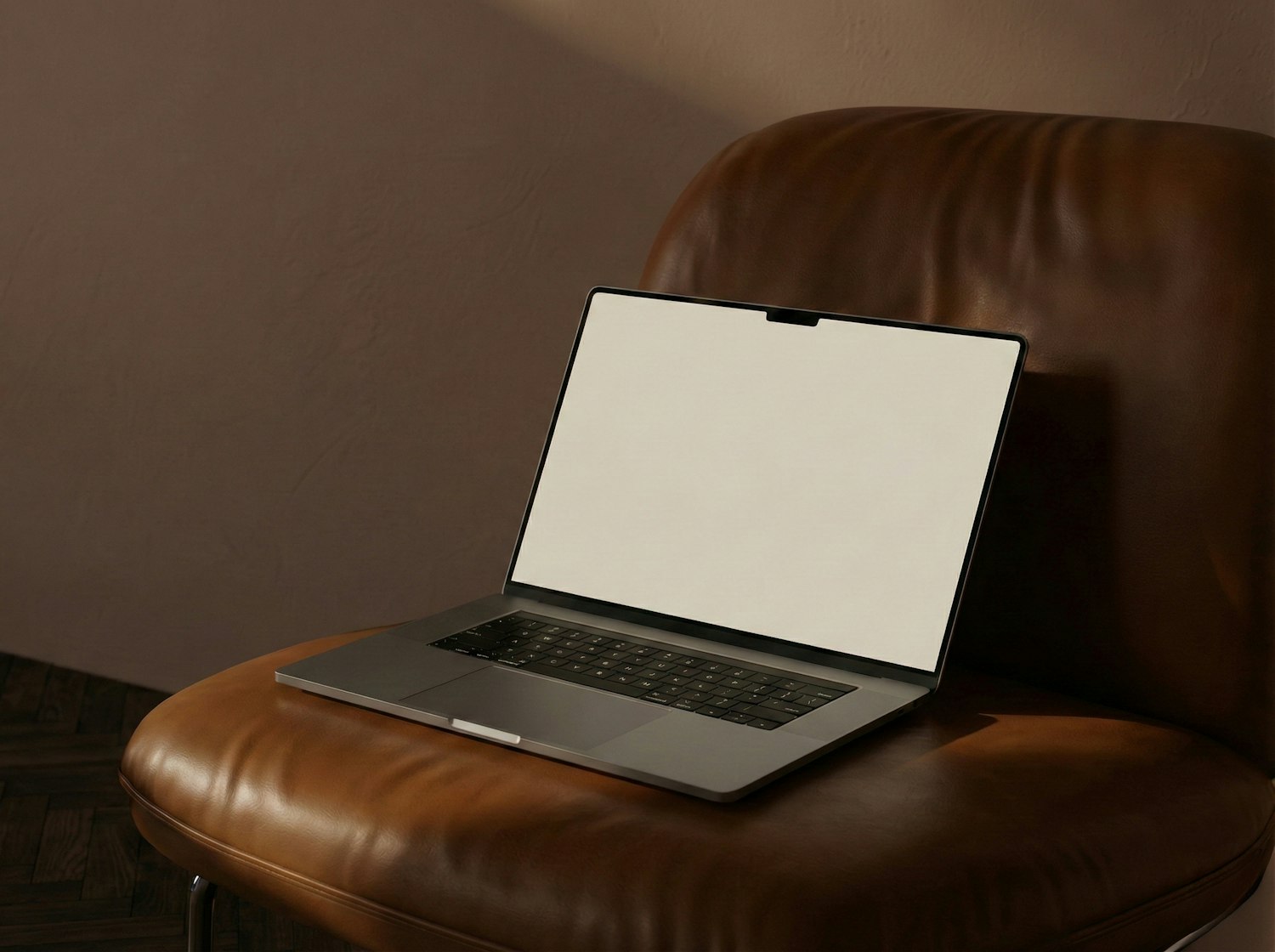 A modern laptop with a blank screen sits on a brown leather chair, creating a minimalist and stylish composition.