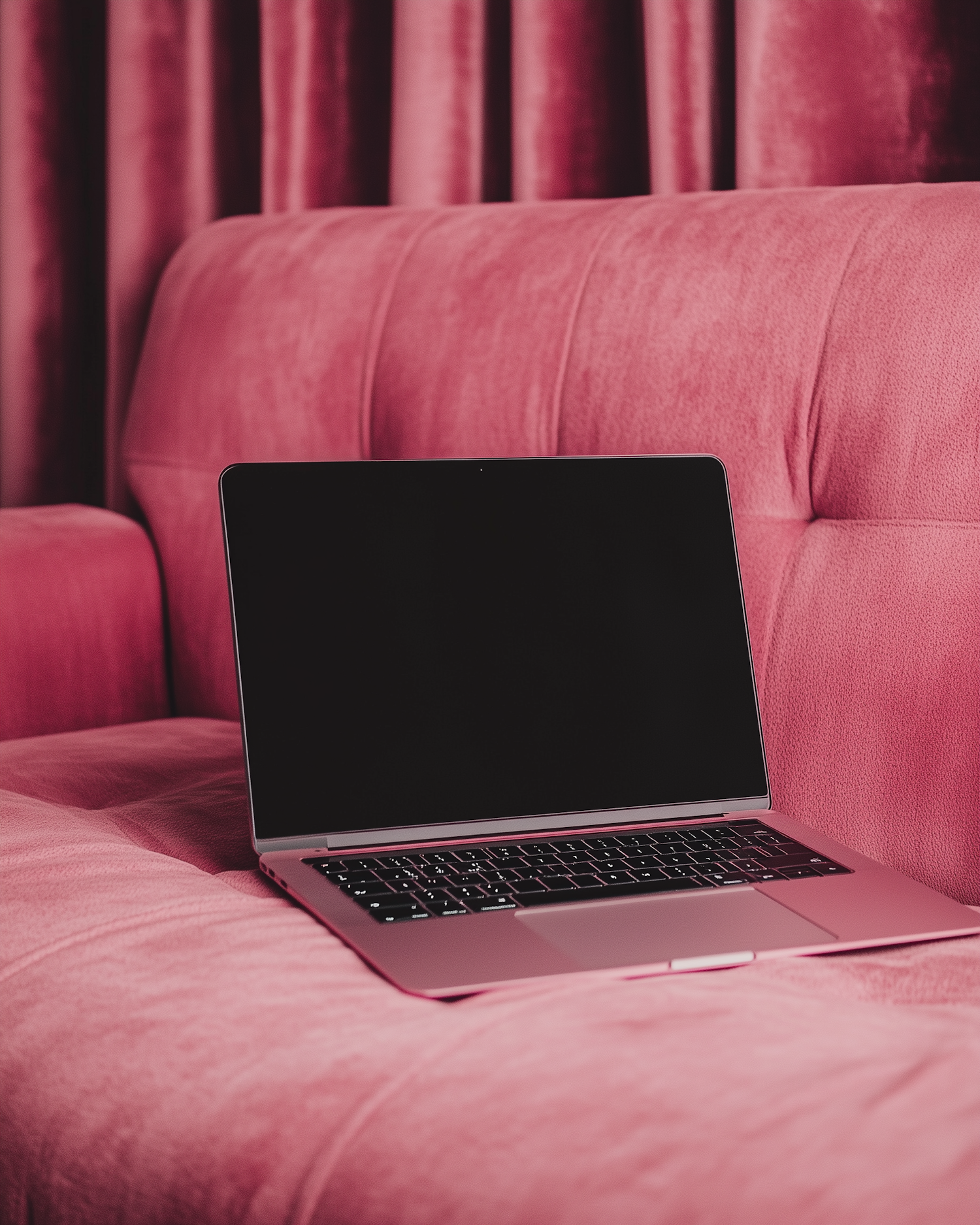 A stylish laptop with a black screen sits on a plush pink sofa, surrounded by matching pink velvet curtains for a chic aesthetic.