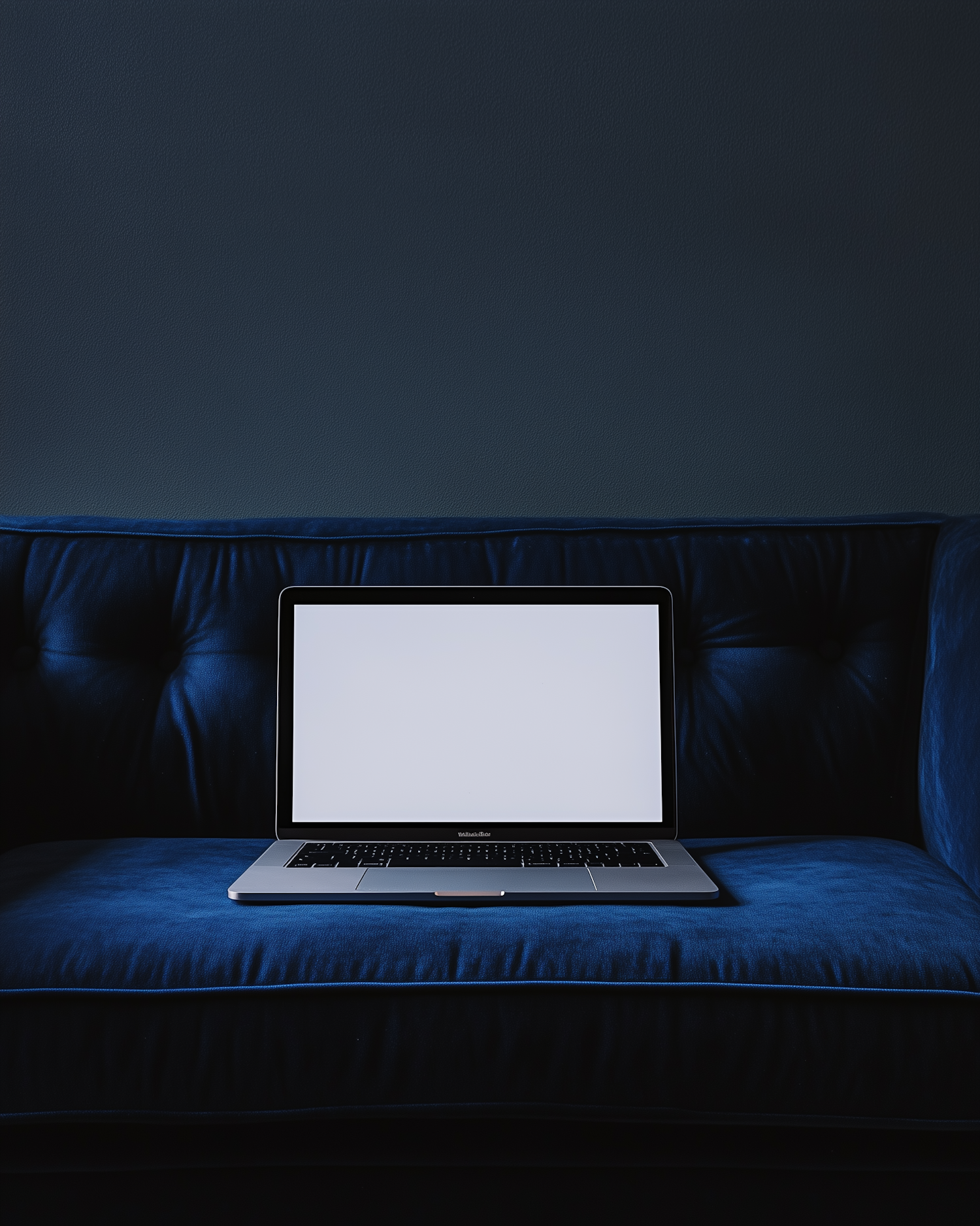 Minimalist setup with a laptop on a dark blue velvet couch, featuring a blank white screen and a modern, sleek aesthetic.