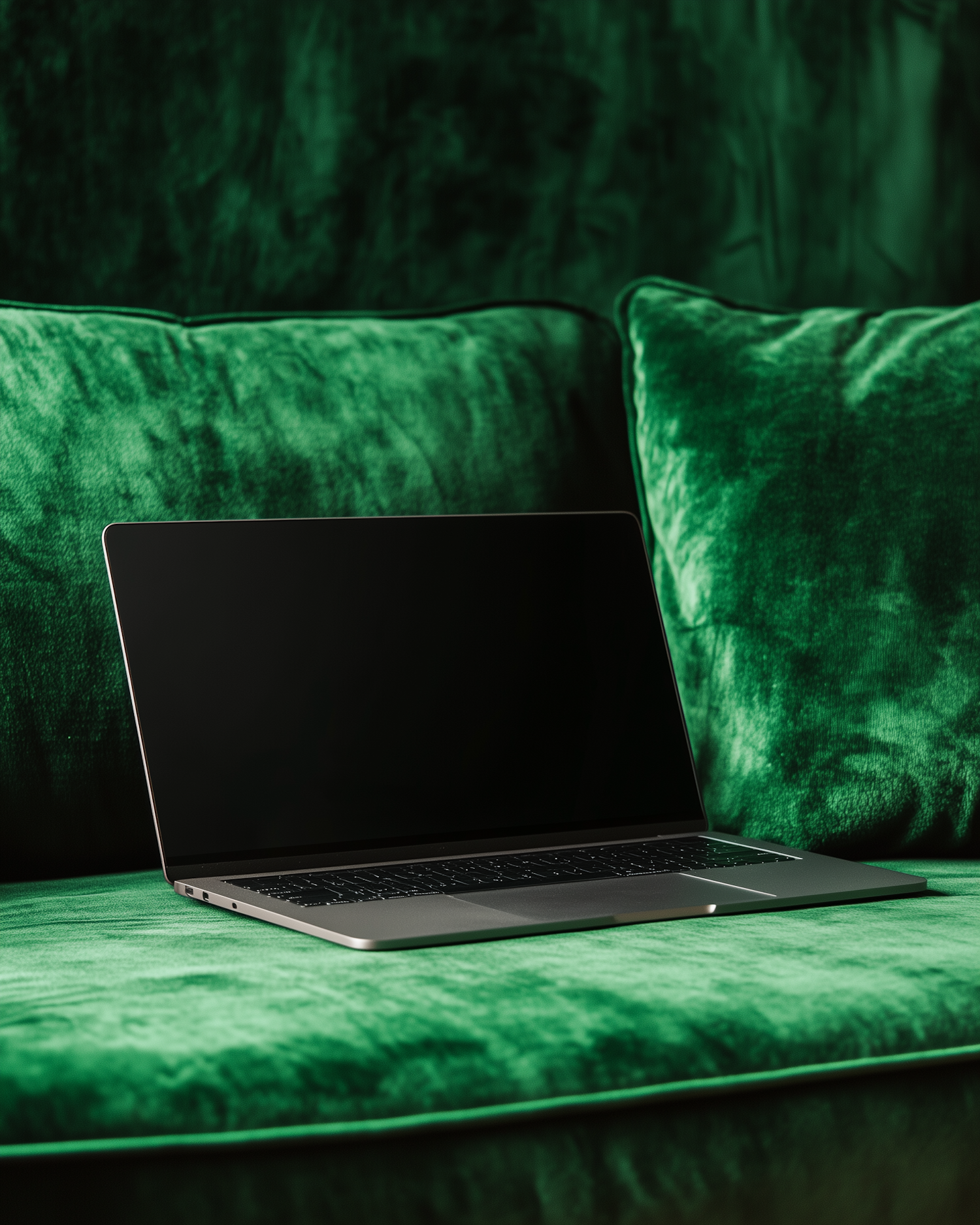 A sleek laptop on a plush green velvet couch, blending modern tech with luxurious comfort in a striking green setting.