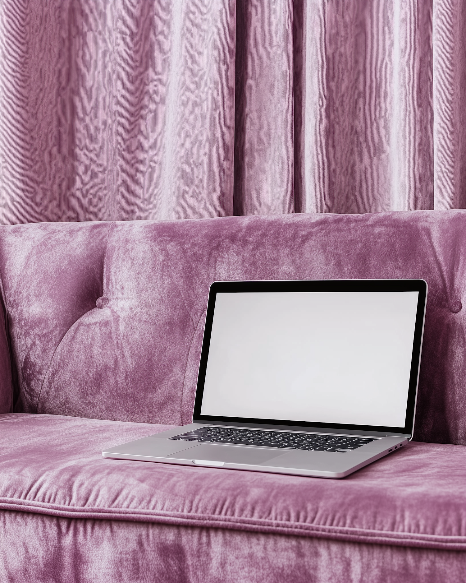 A silver laptop with a blank screen on a plush lavender velvet sofa, paired with matching curtains for a cozy, modern vibe.