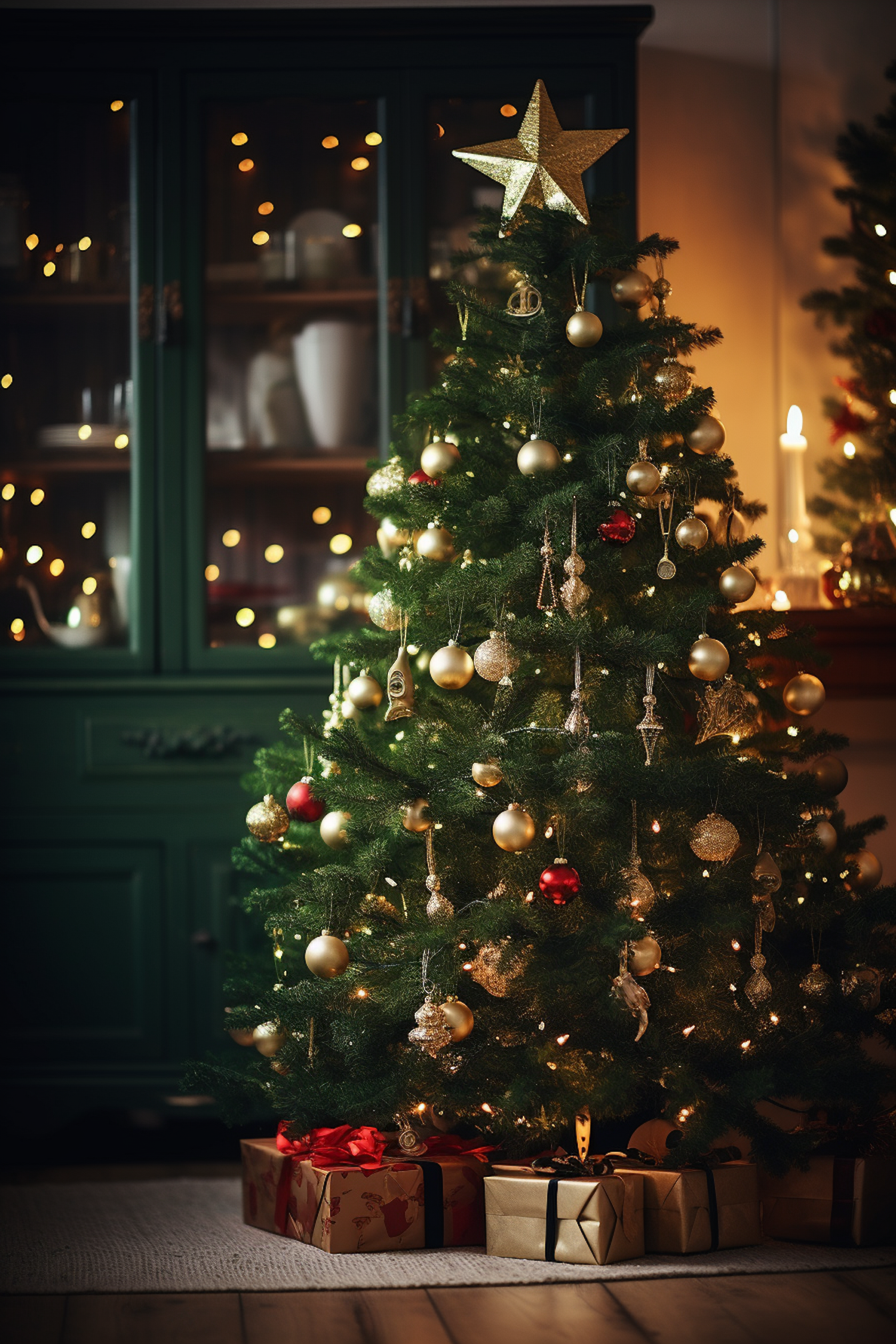 Festive Christmas tree with gold and red ornaments, glowing lights, and wrapped gifts in a cozy room setting.