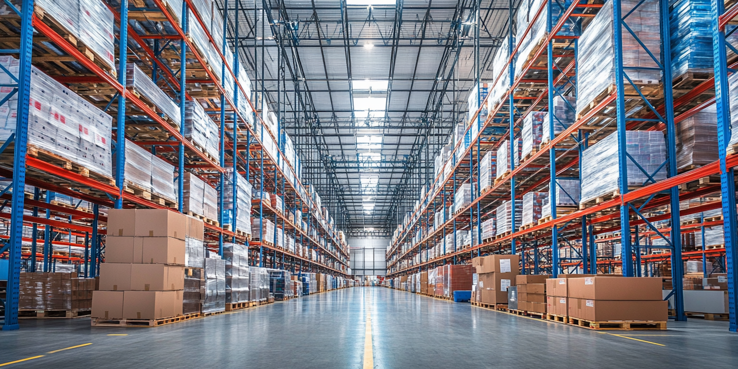 Spacious warehouse with towering shelves, stacked pallets, and organized inventory. Bright lighting and polished floors enhance the industrial setting.