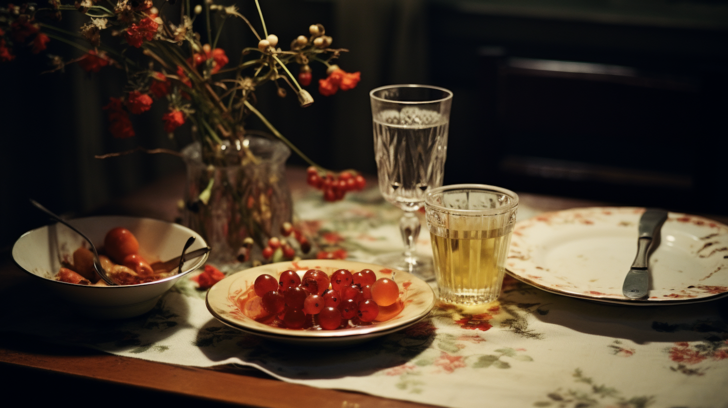 Cozy dining scene with floral tablecloth, dried flowers, red berries, and glasses on a wooden table.