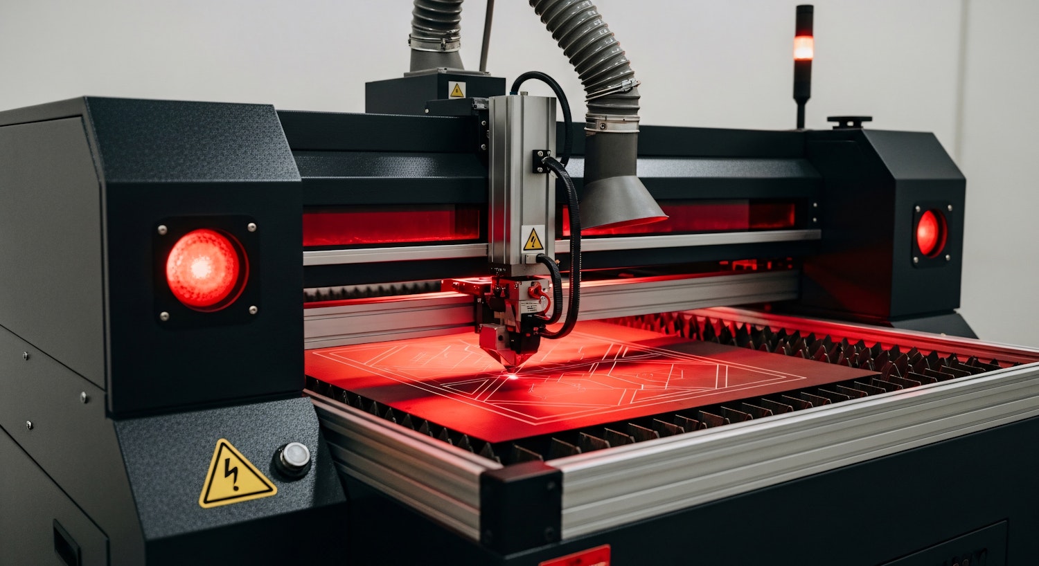 A laser cutting machine etching intricate patterns on a red surface in a clean industrial setting, with glowing red lights and safety features.