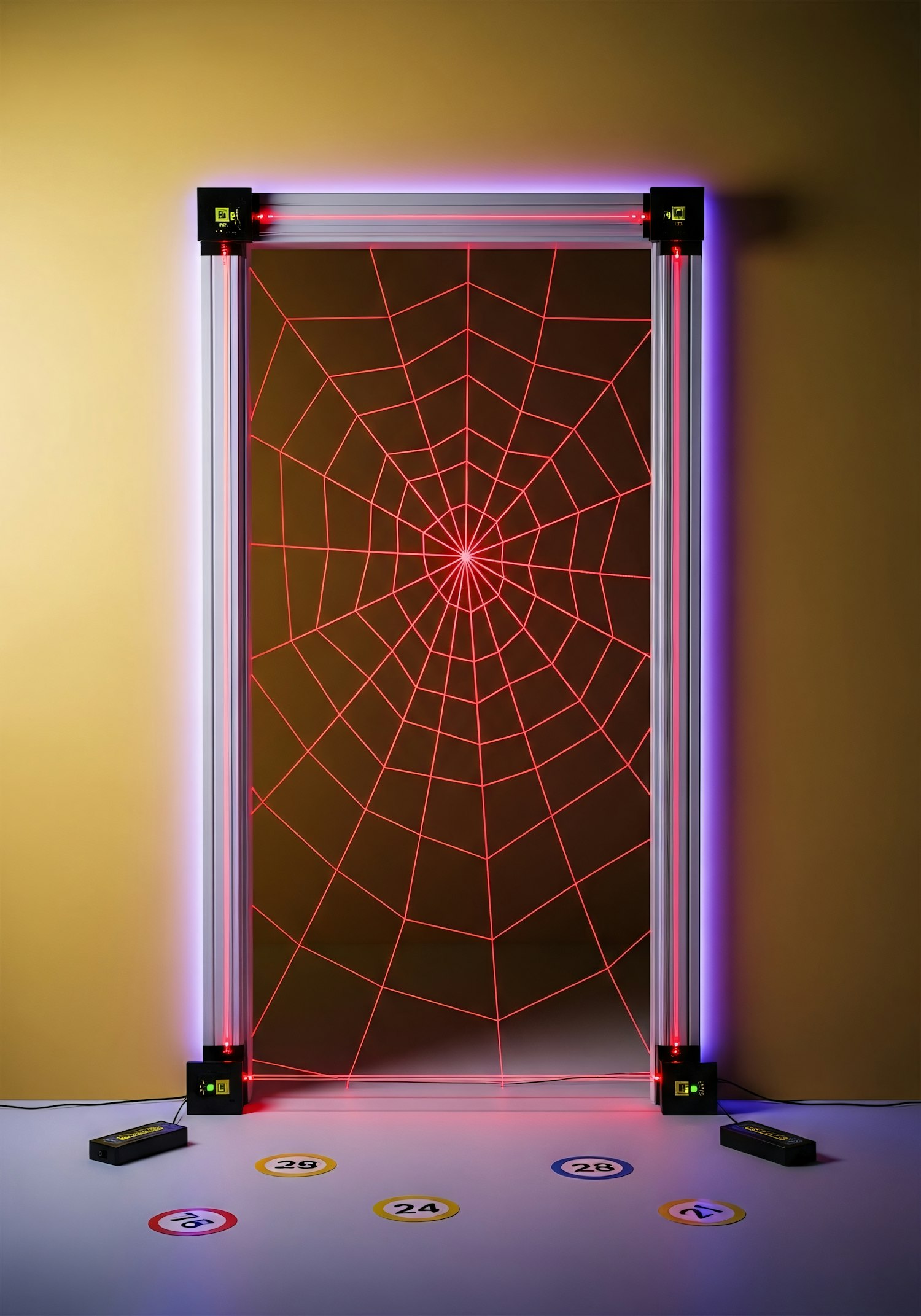 A glowing red laser web within a purple-lit frame, set against a yellow background with colorful numbered markers on the floor.