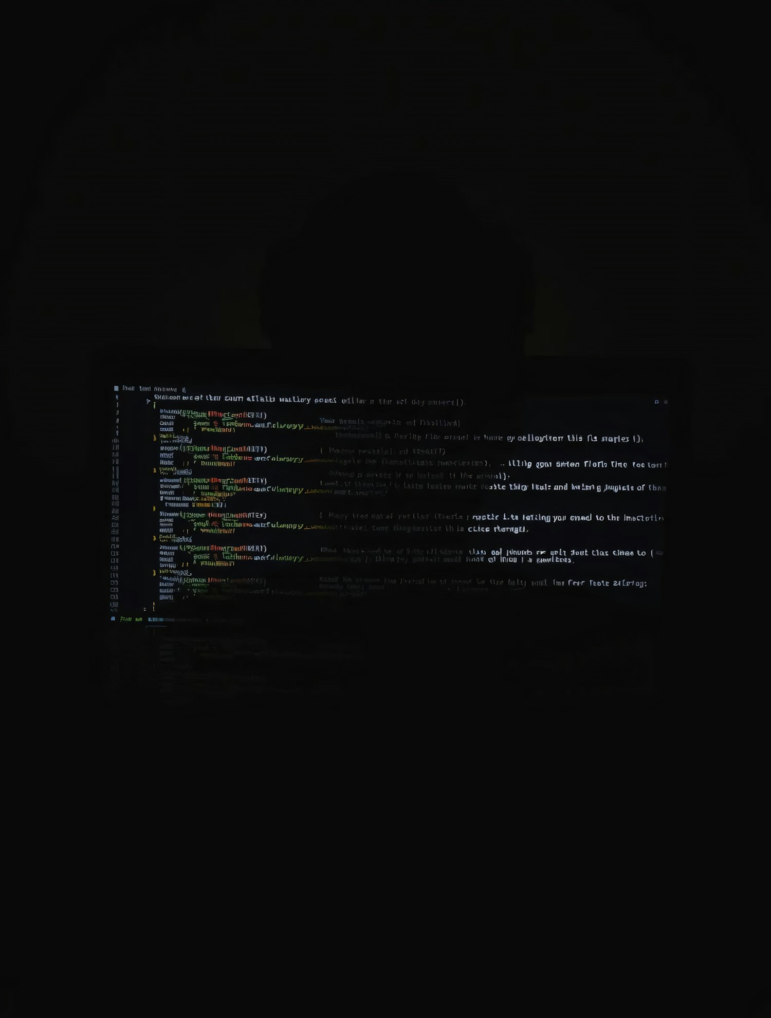 A dark scene with a computer monitor displaying colorful code, with a faint silhouette of a person in the background.