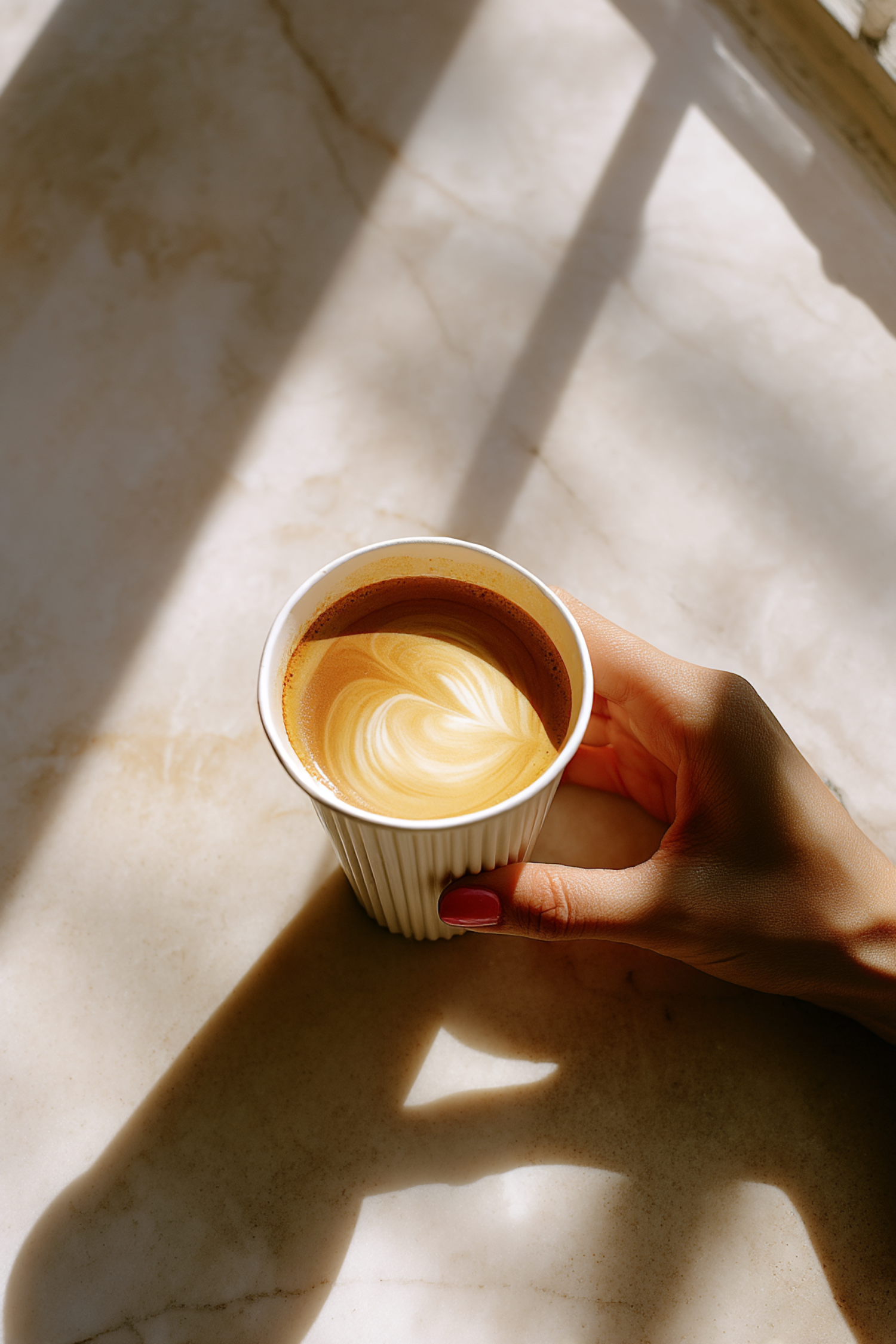 A hand holding a latte with heart-shaped art in a white cup, set on a sunlit marble surface with soft shadows.