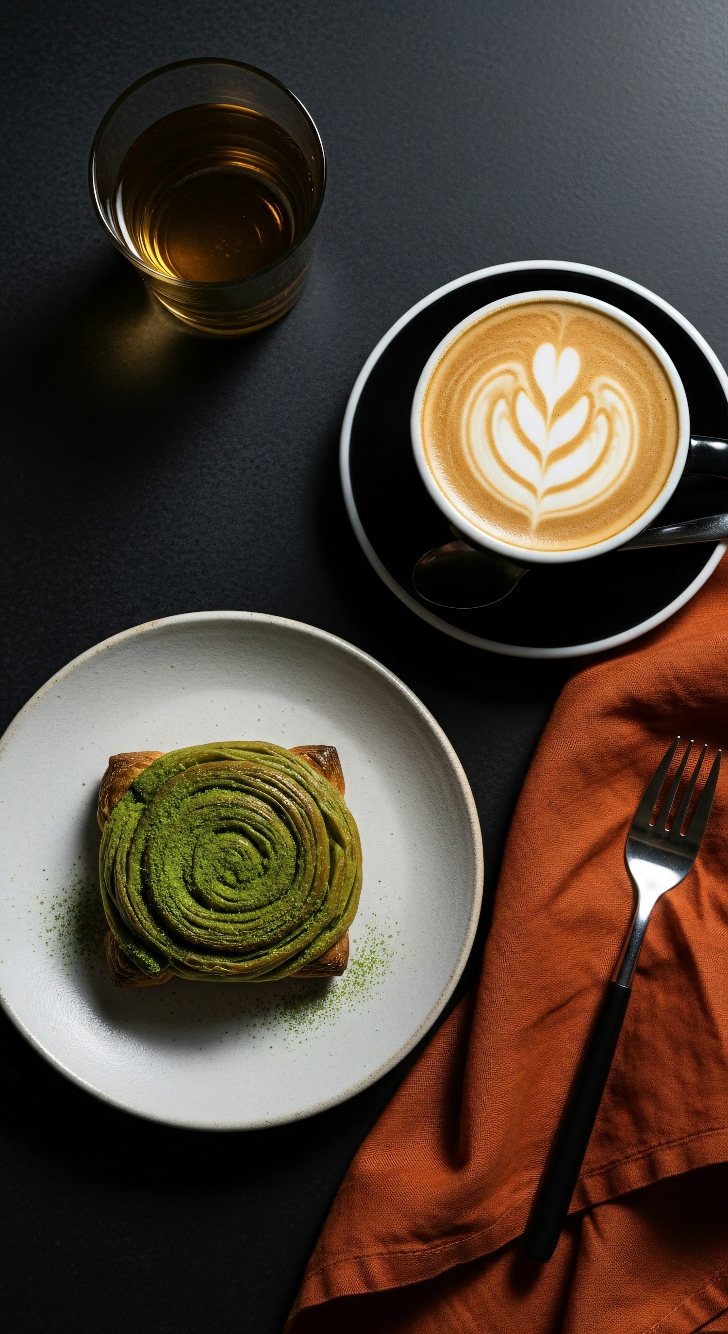 A cozy setup with a latte, matcha pastry, and tea on a dark table, complemented by an orange napkin and elegant plating.