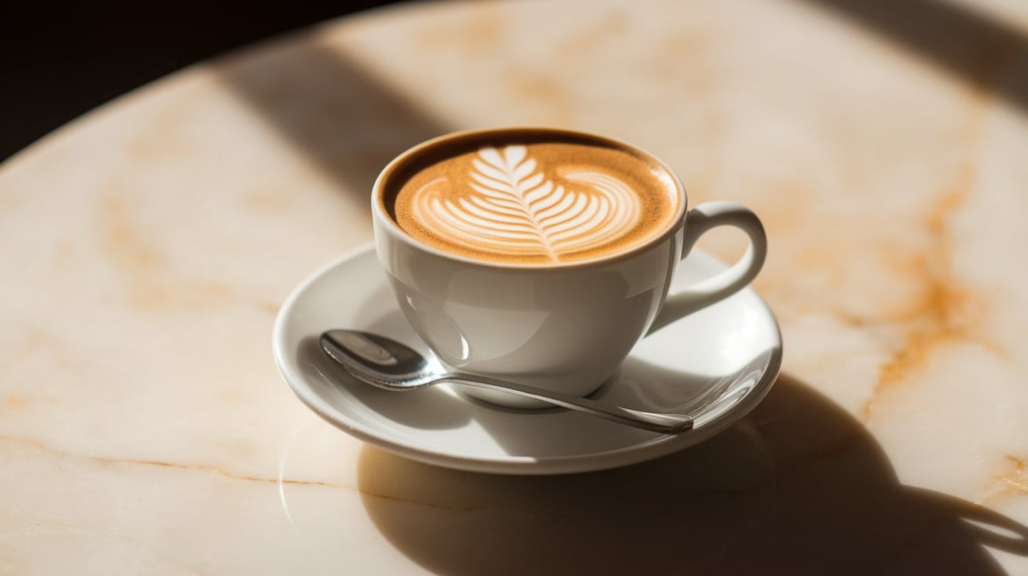 A beautifully crafted latte with leaf art in a white cup on a marble table, paired with a silver spoon. Warm and inviting vibes.