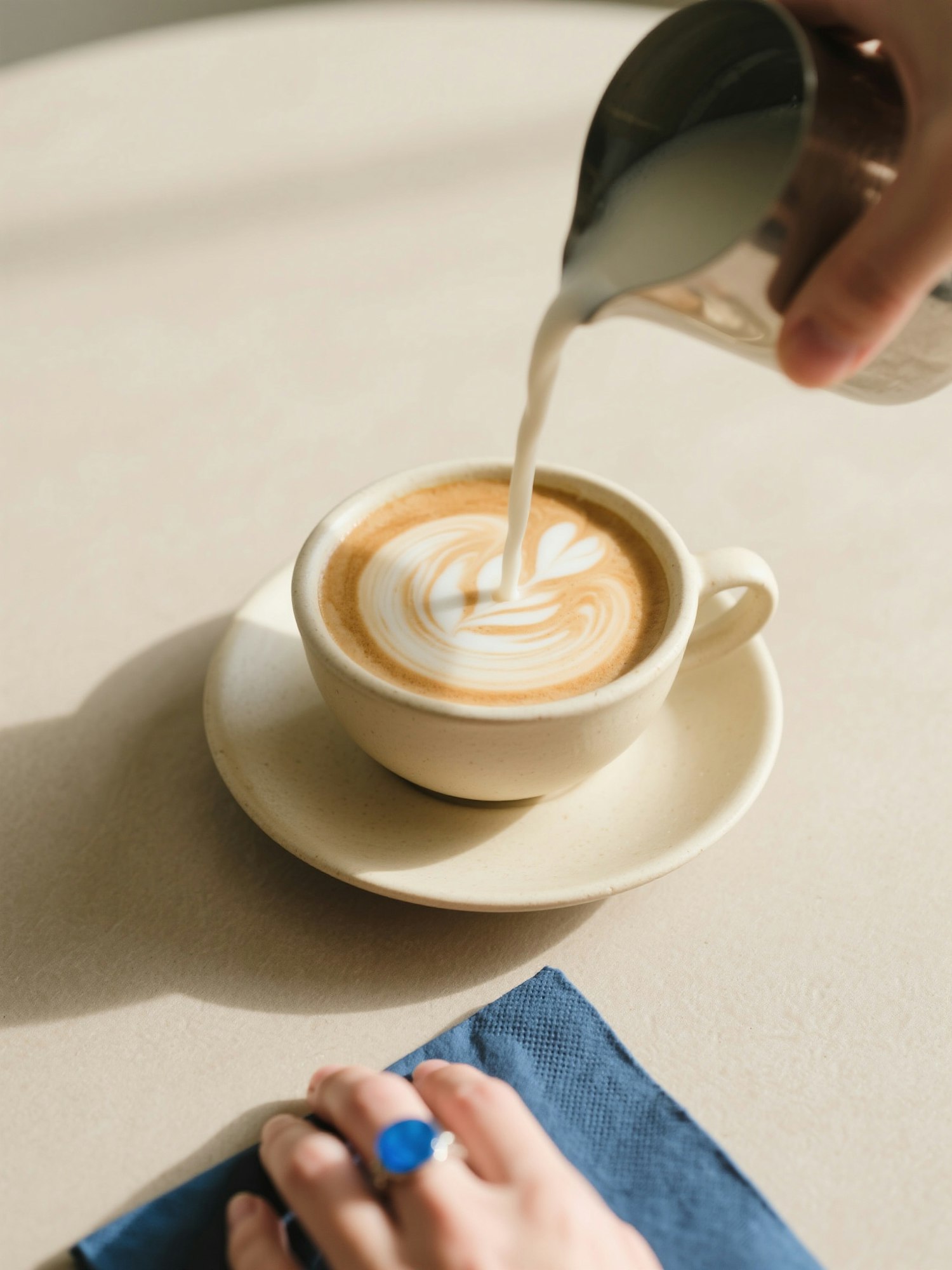 Overhead shot of milk being poured into a latte, cream ceramic cup on a beige matte table, soft shadows, calm background, electric blue ring on the person’s finger or napkin in frame, inspired by still-life food styling from Kinfolk Magazine