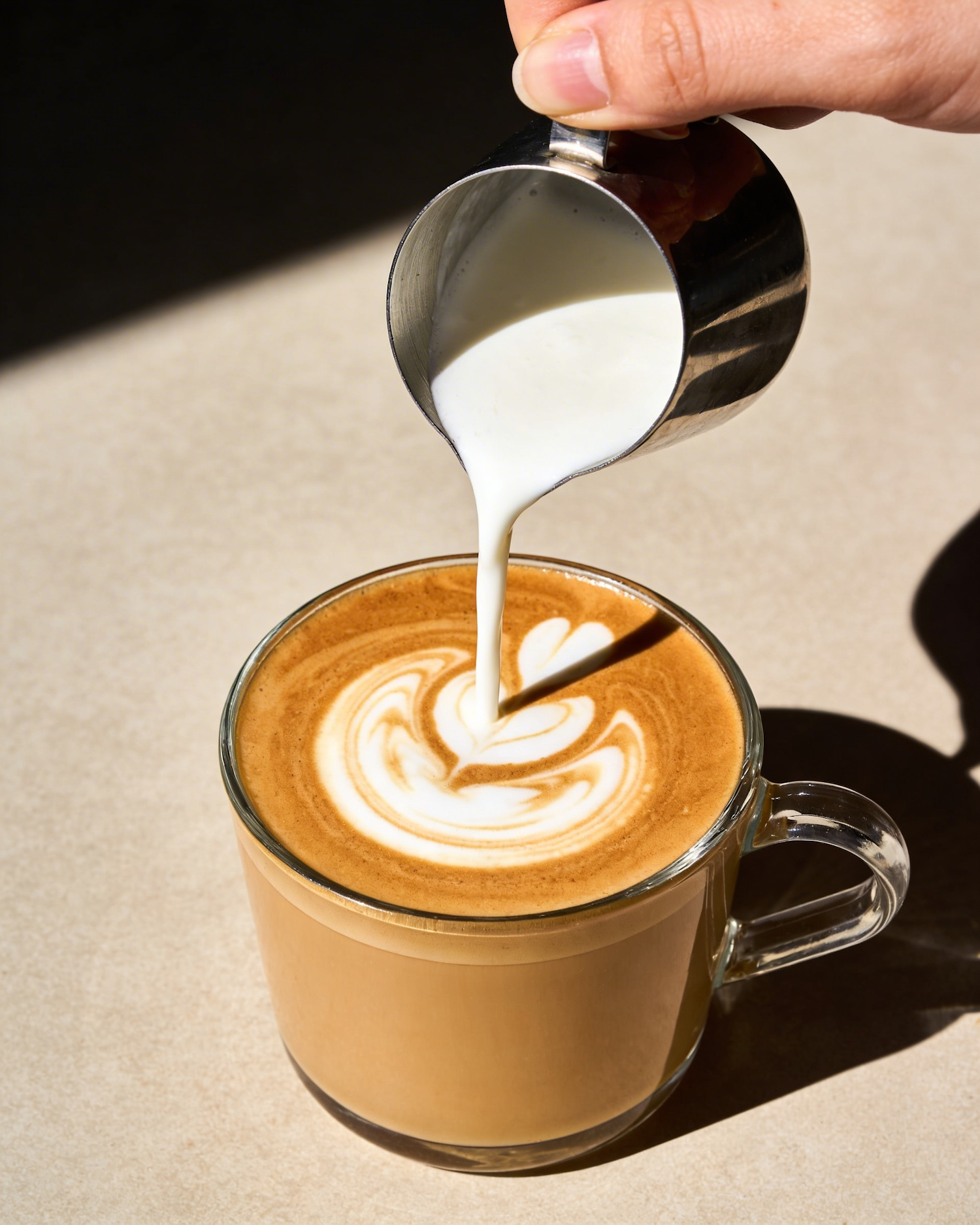 A latte with intricate art being created as milk is poured into a glass cup, showcasing a heart-shaped design on the coffee's surface.
