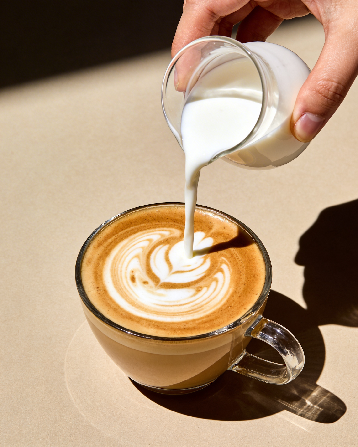 A hand pours milk into a coffee cup, creating beautiful latte art in a clear glass mug, set against a neutral background.