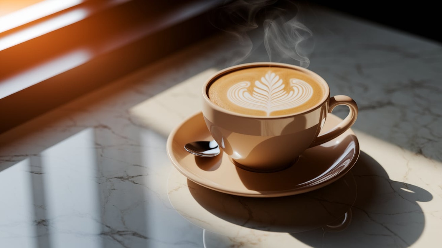 A warm latte with fern-shaped latte art in a beige cup on a marble countertop, bathed in soft sunlight. Perfect cozy coffee moment.