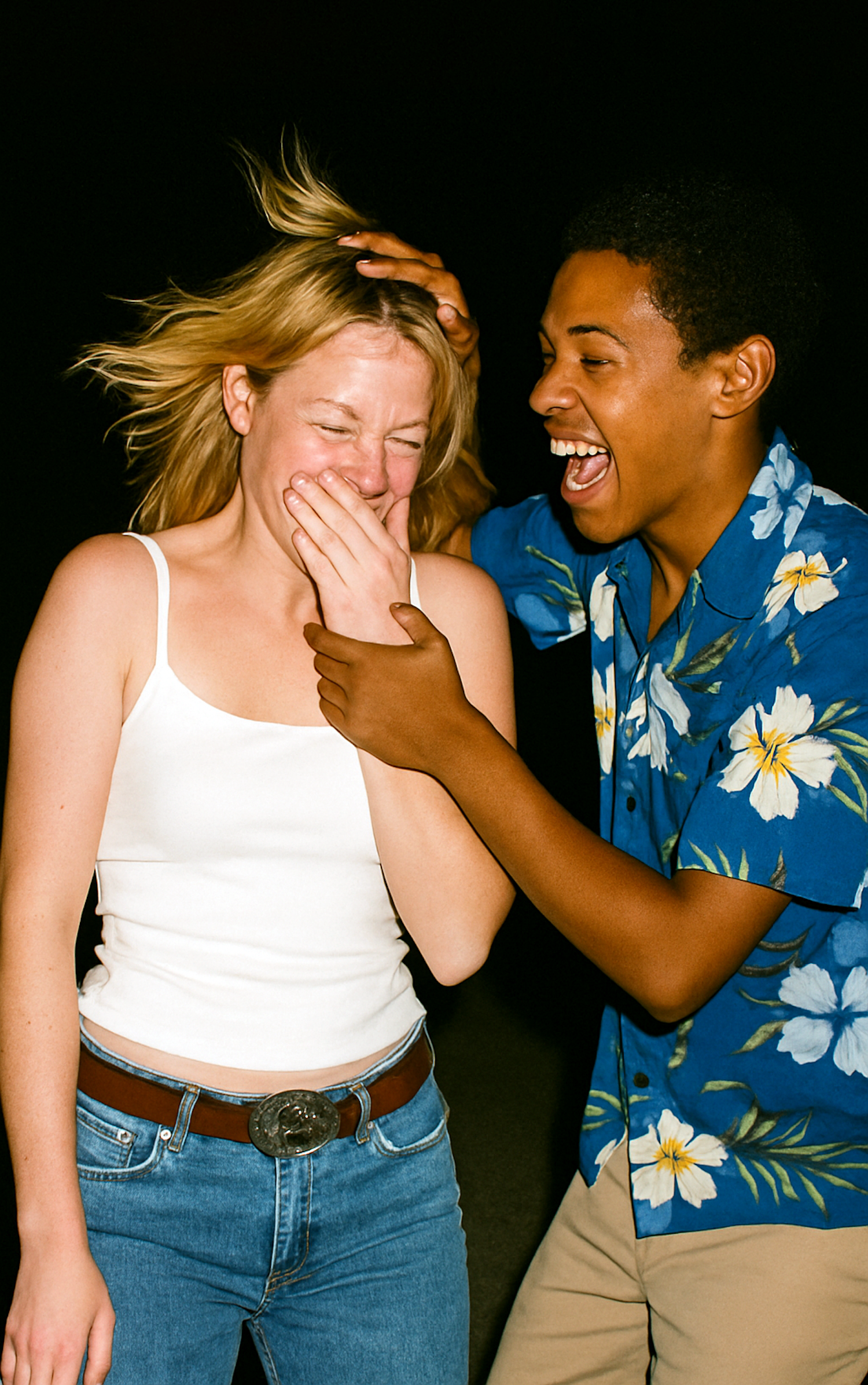 Two friends share a joyful laugh at night, with vibrant expressions and casual outfits adding to the lively moment.