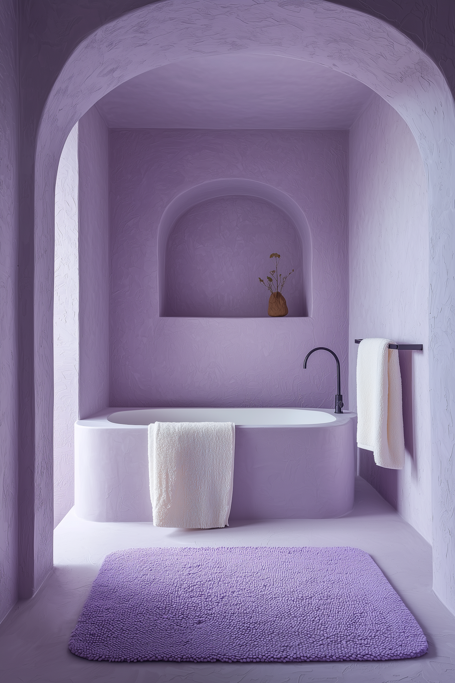 A lavender-themed bathroom with a modern tub, black faucet, white towels, and a textured bath mat for a calming, cohesive look.