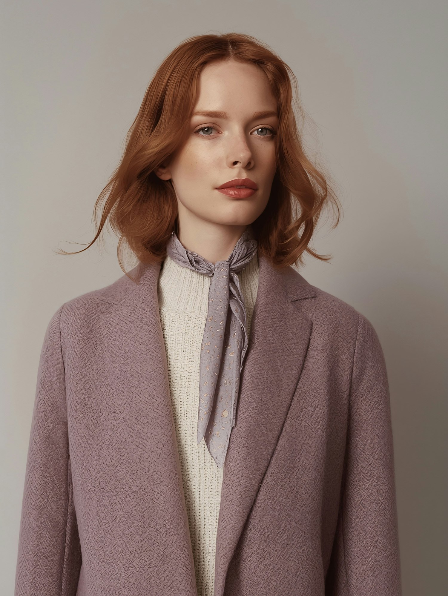 A woman with red hair in a lavender coat and scarf poses against a neutral background, showcasing a stylish and elegant look.