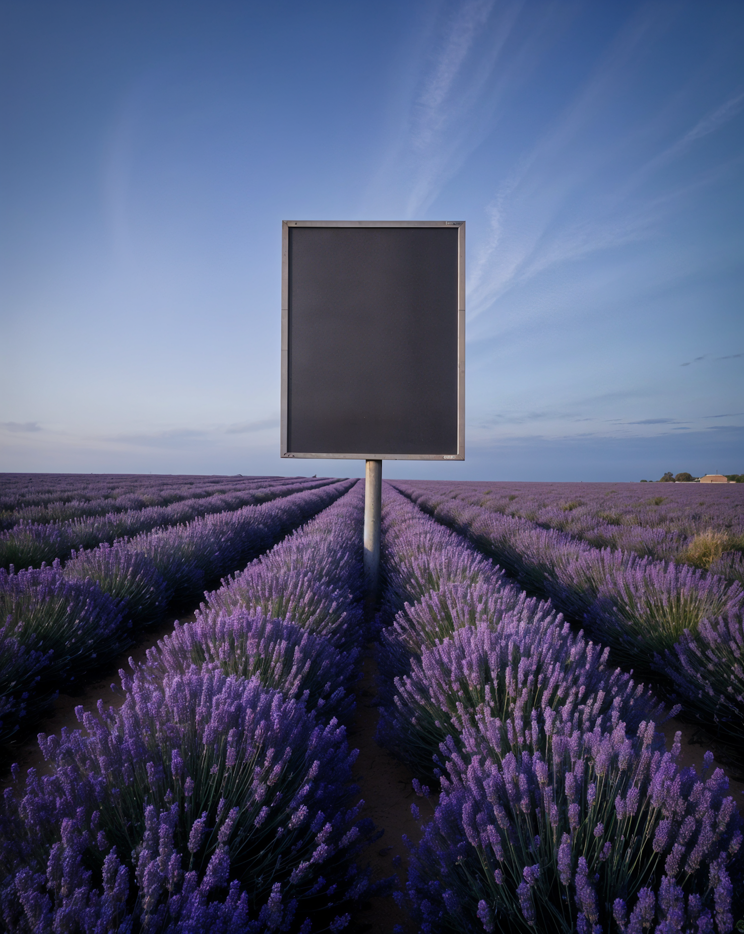Empty billboard in a vast lavender field under a clear blue sky, creating a striking contrast between nature and man-made structure.