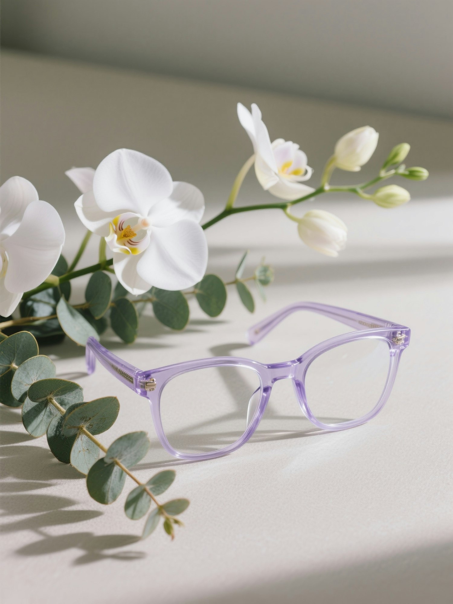 — modern translucent acetate eyeglasses in soft pastel lavender, placed against a composition of white orchids and eucalyptus leaves, stems carefully arranged beside the frame, creating a balanced and airy aesthetic