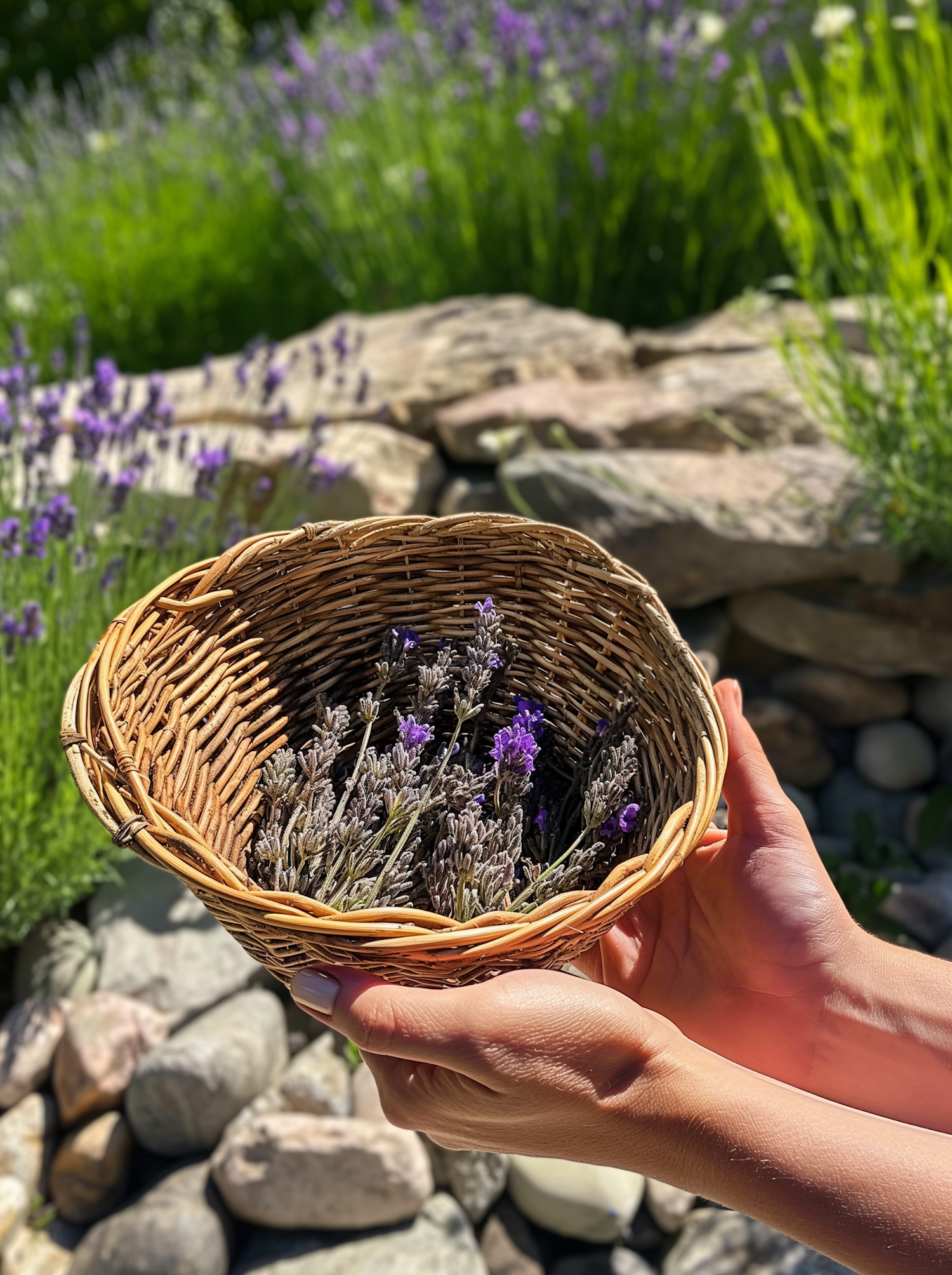 Hands holding a wicker basket filled with lavender in a sunlit garden, surrounded by lush greenery and stone walls.