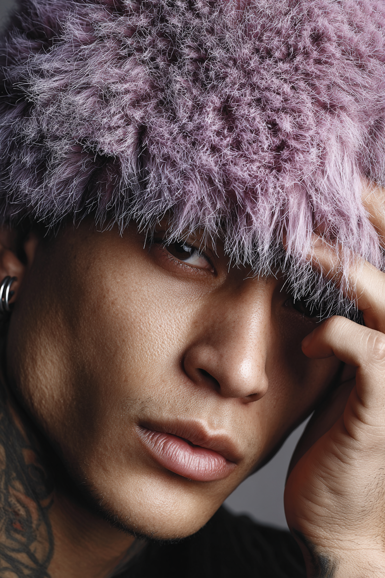 Close-up portrait of a person with a lavender fluffy hat, medium skin tone, and contemplative expression, showcasing texture and detail.