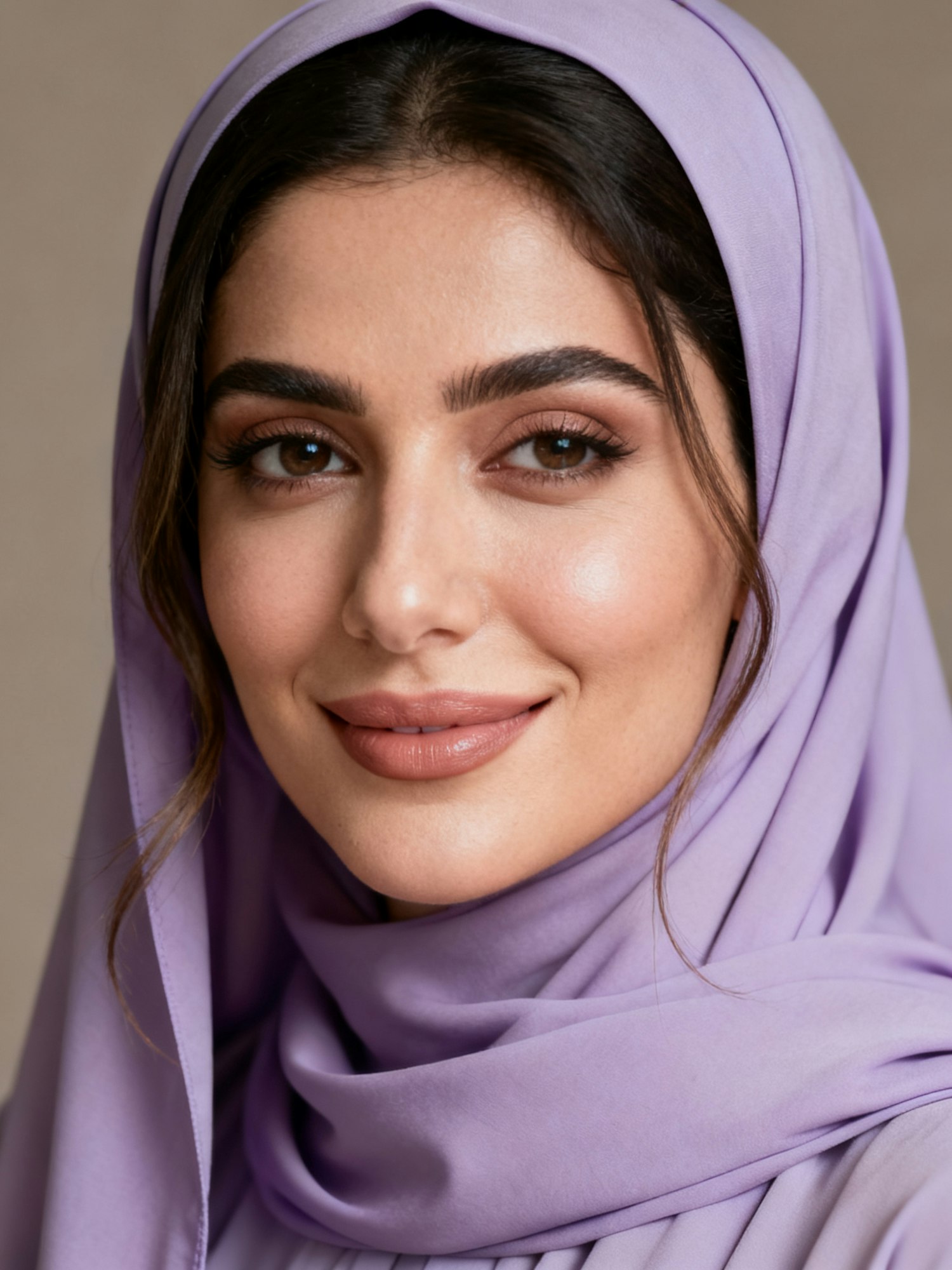 Studio portrait of an Arab woman. She wears a light purple abaya and a matching hijab that elegantly frames her face, with a few strands of hair subtly visible at the front. Her complexion is light ivory with cool undertones, showcasing smooth, healthy skin with natural texture. Her face is beautifully rendered with realistic, sharp detail, featuring natural, subtle makeup that enhances her features without being exaggerated. Her expression conveys warm professionalism. The lighting is Rembrandt, highlighting her features. A neutral seamless backdrop provides a clean setting. Captured with a 105mm lens for macro-sharp detail. Photorealistic, editorial quality. Negative: Overly airbrushed skin, unnatural skin blur, "youthifying" filters, exaggerated wrinkle removal, heavy makeup, artificial smile, distracting background elements.