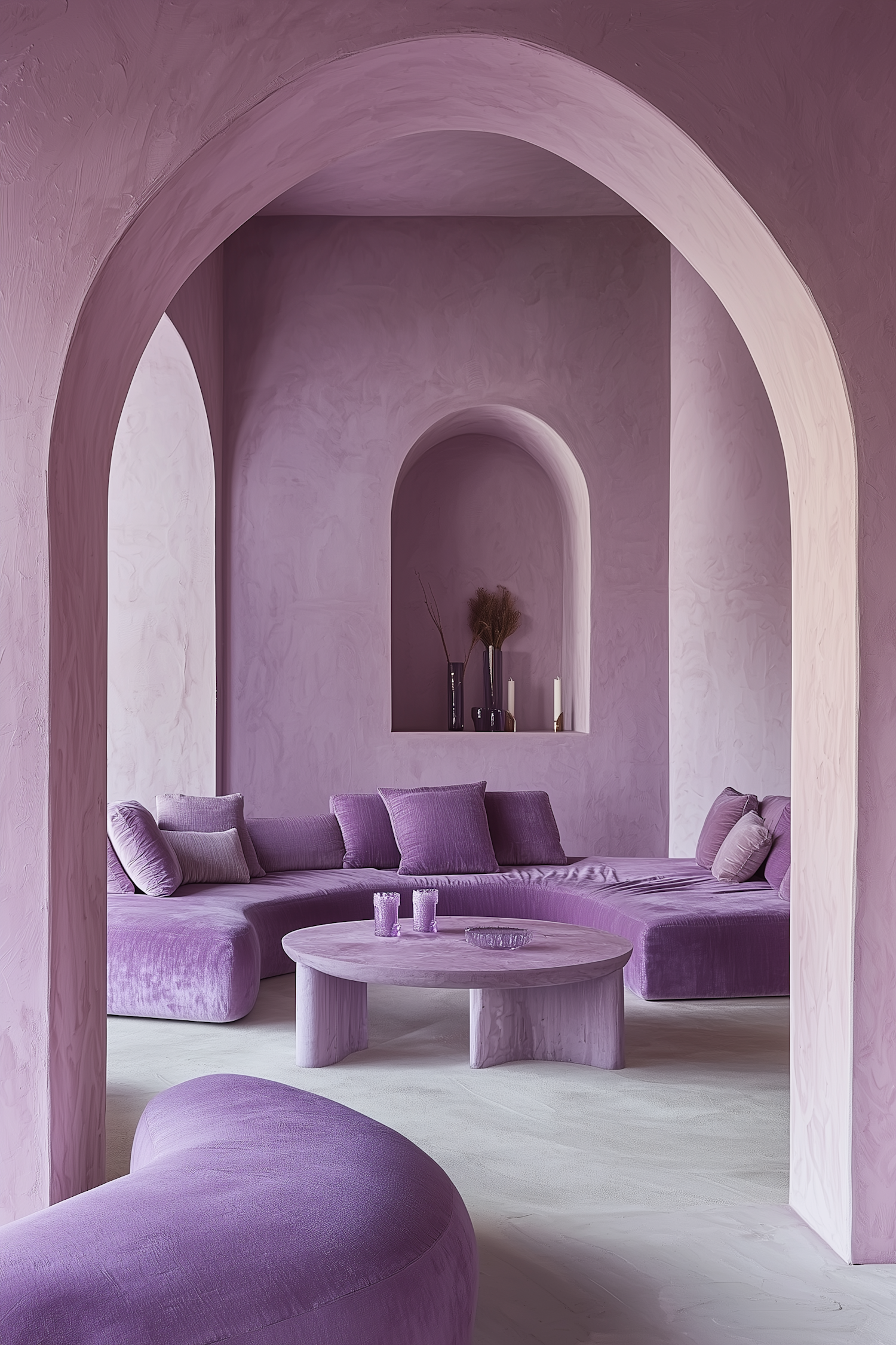 Lavender-themed modern interior with curved furniture, arched niches, and soft textures creating a serene and elegant ambiance.