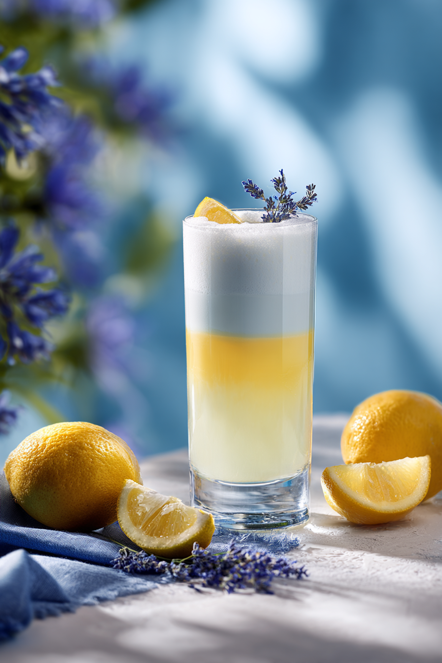 A refreshing layered drink garnished with lavender and lemon, surrounded by fresh lemons and a soft blue background.