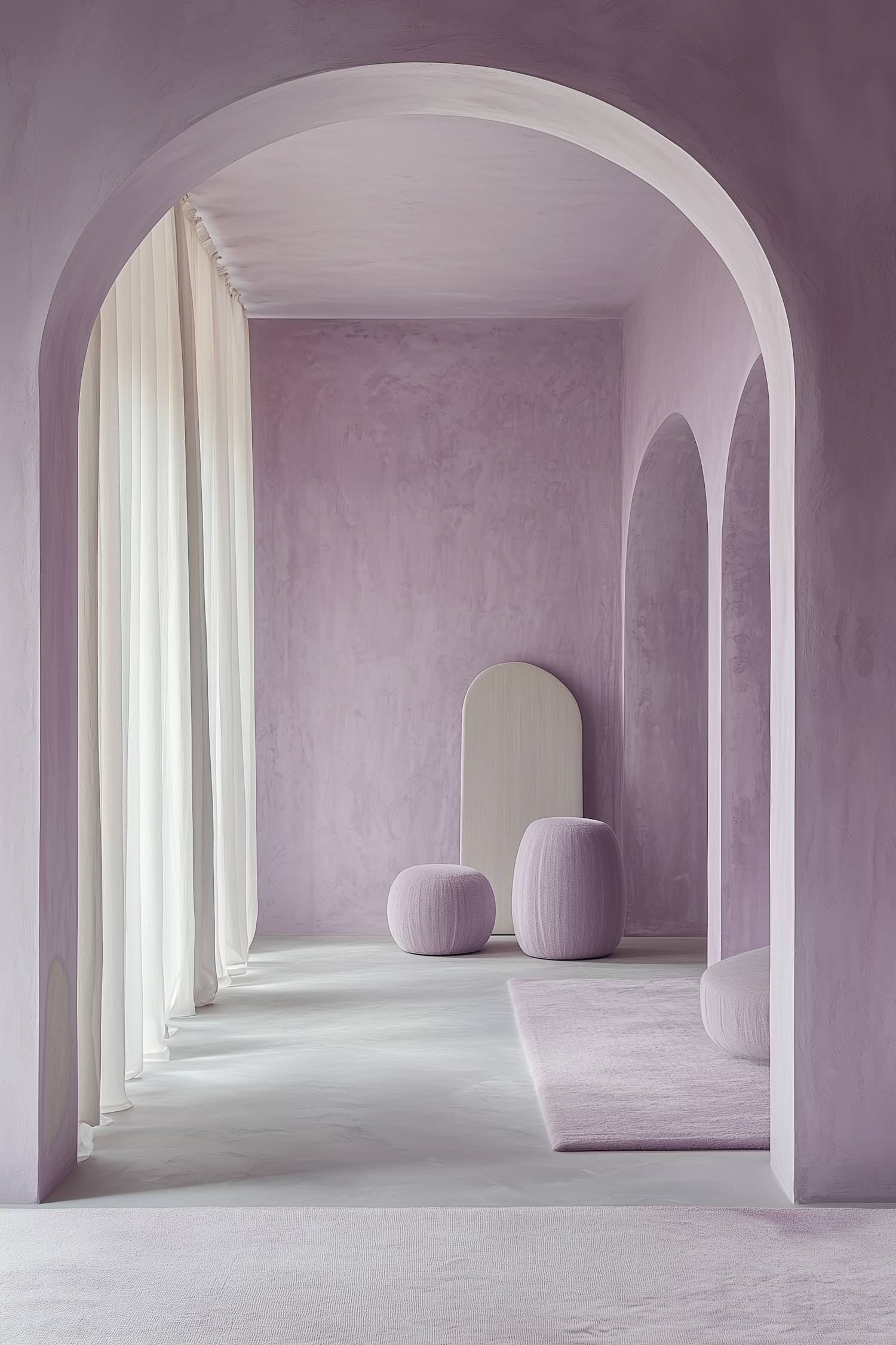 Minimalist lavender-toned room with arched doorways, soft lighting, and cozy poufs for a serene and elegant ambiance.