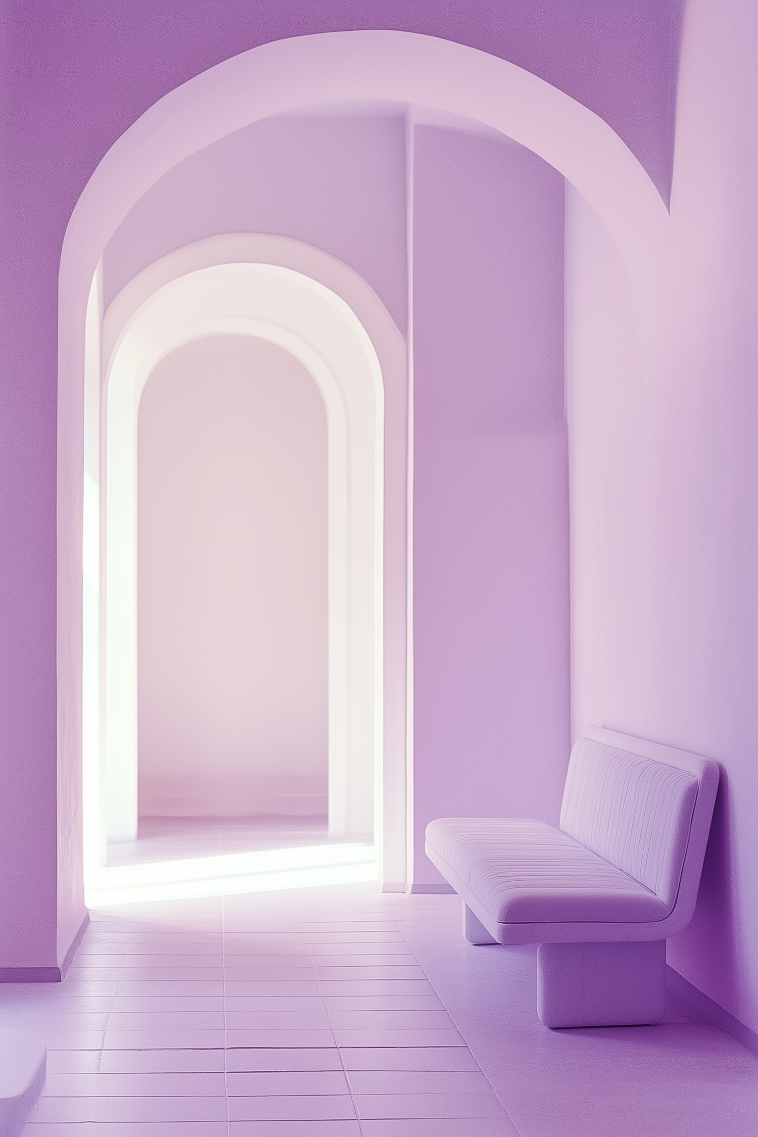 Minimalist lavender interior with arched doorways and a modern bench, creating a serene and elegant atmosphere with soft lighting.