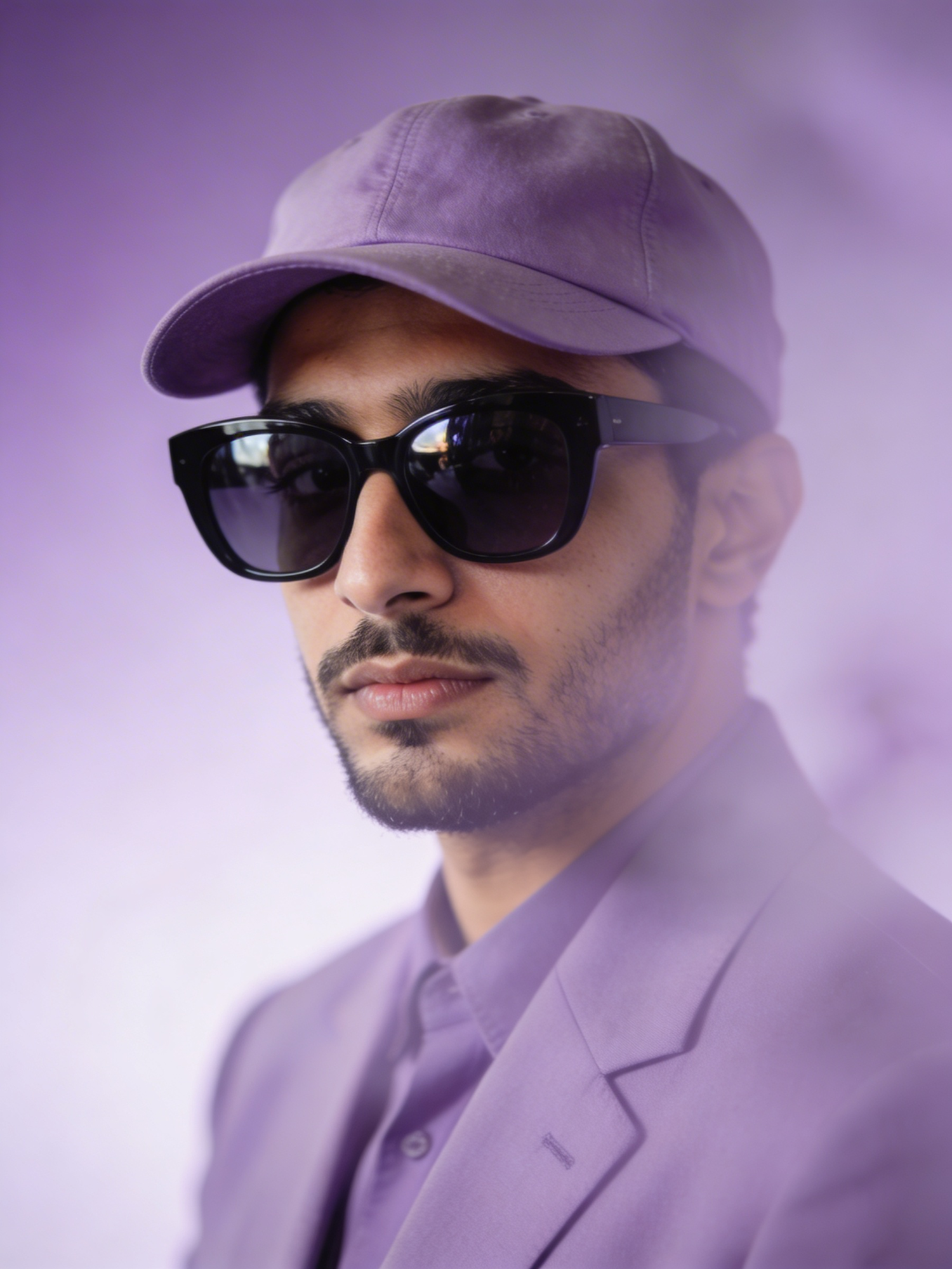 A monochrome lavender portrait of a Middle Eastern man wearing a lilac blazer, matching cap, and oversized black sunglasses. The lavender background is soft and hazy, giving the scene a dreamy, ethereal quality. High‑resolution lighting highlights the textures and pastel tones.
