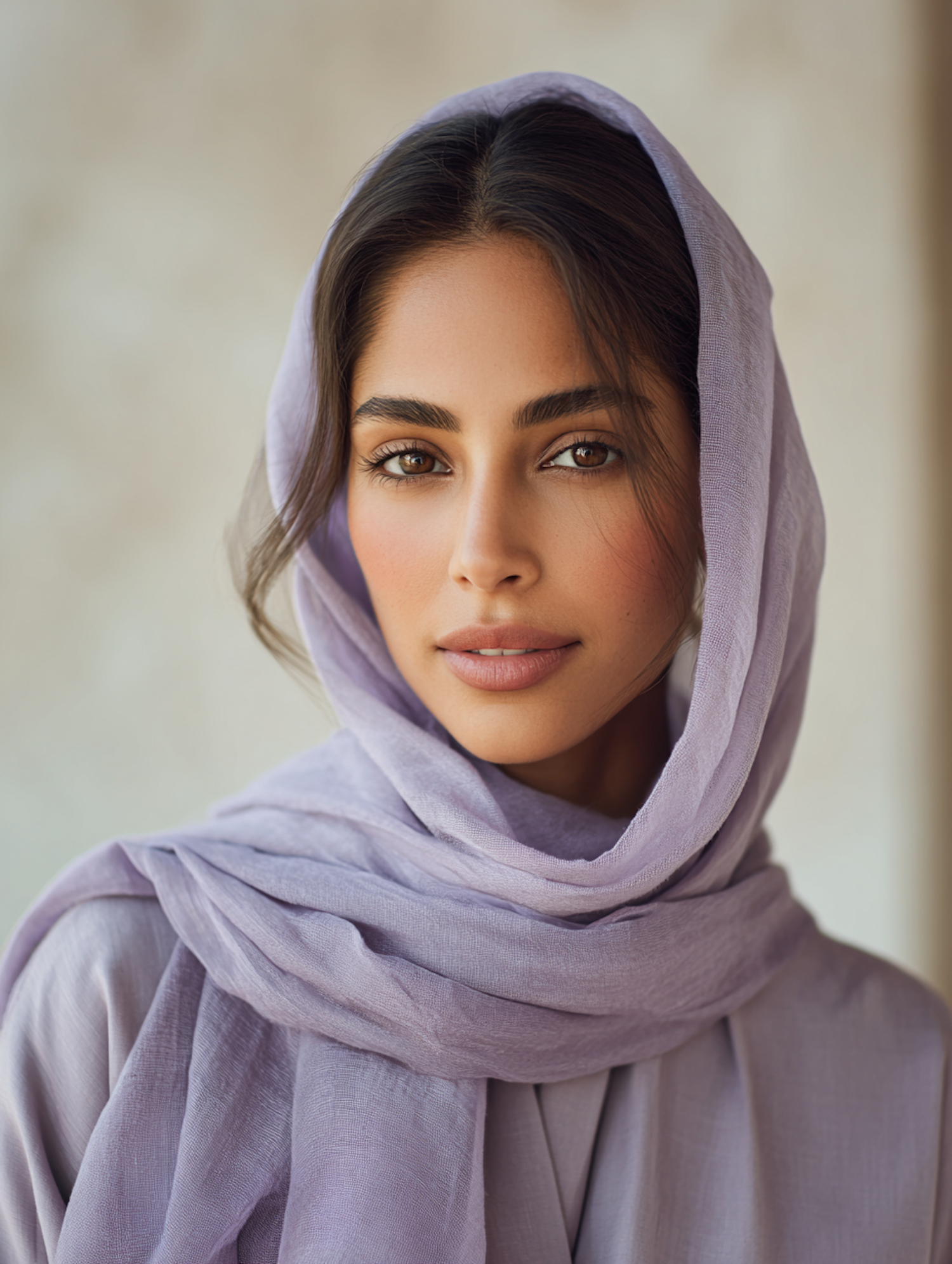 A woman in a lavender headscarf gazes softly, her warm complexion and expressive eyes highlighted against a blurred background.
