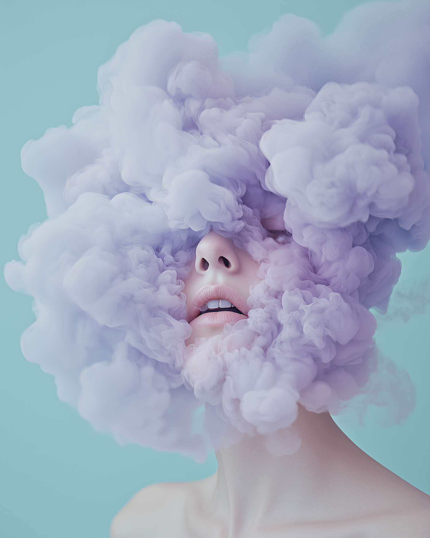 A surreal portrait of a face surrounded by lavender smoke against a teal background, creating a dreamy and ethereal vibe.