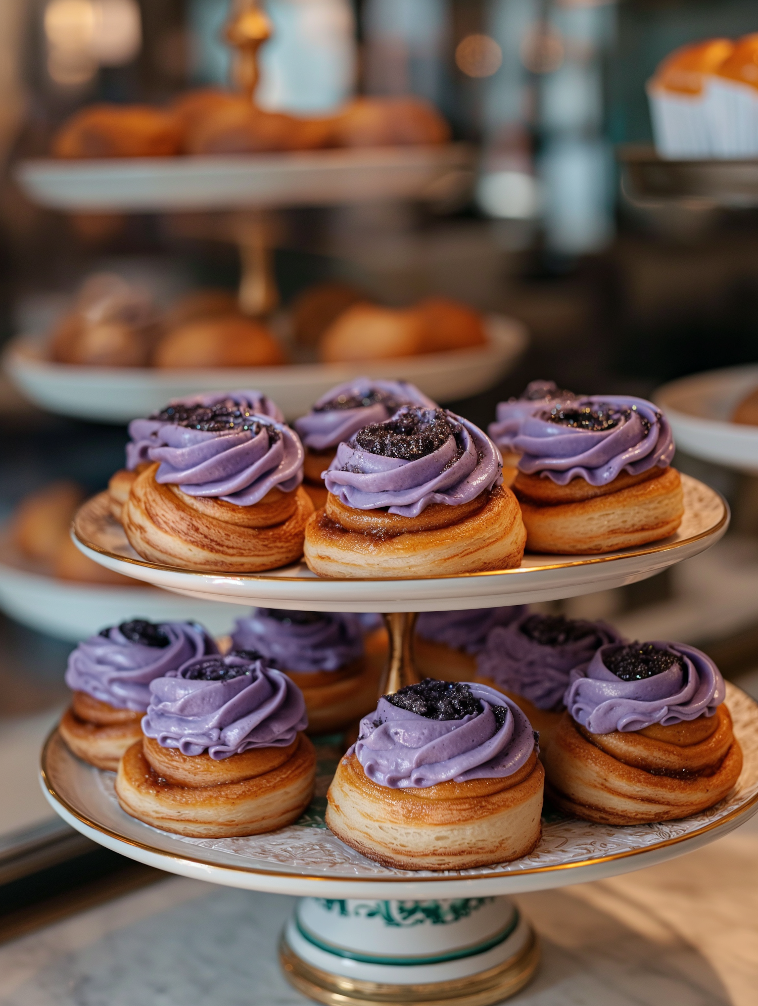 Tiered stand with pastries topped with purple frosting and dark berry-like centers, set in a warm, inviting bakery display.