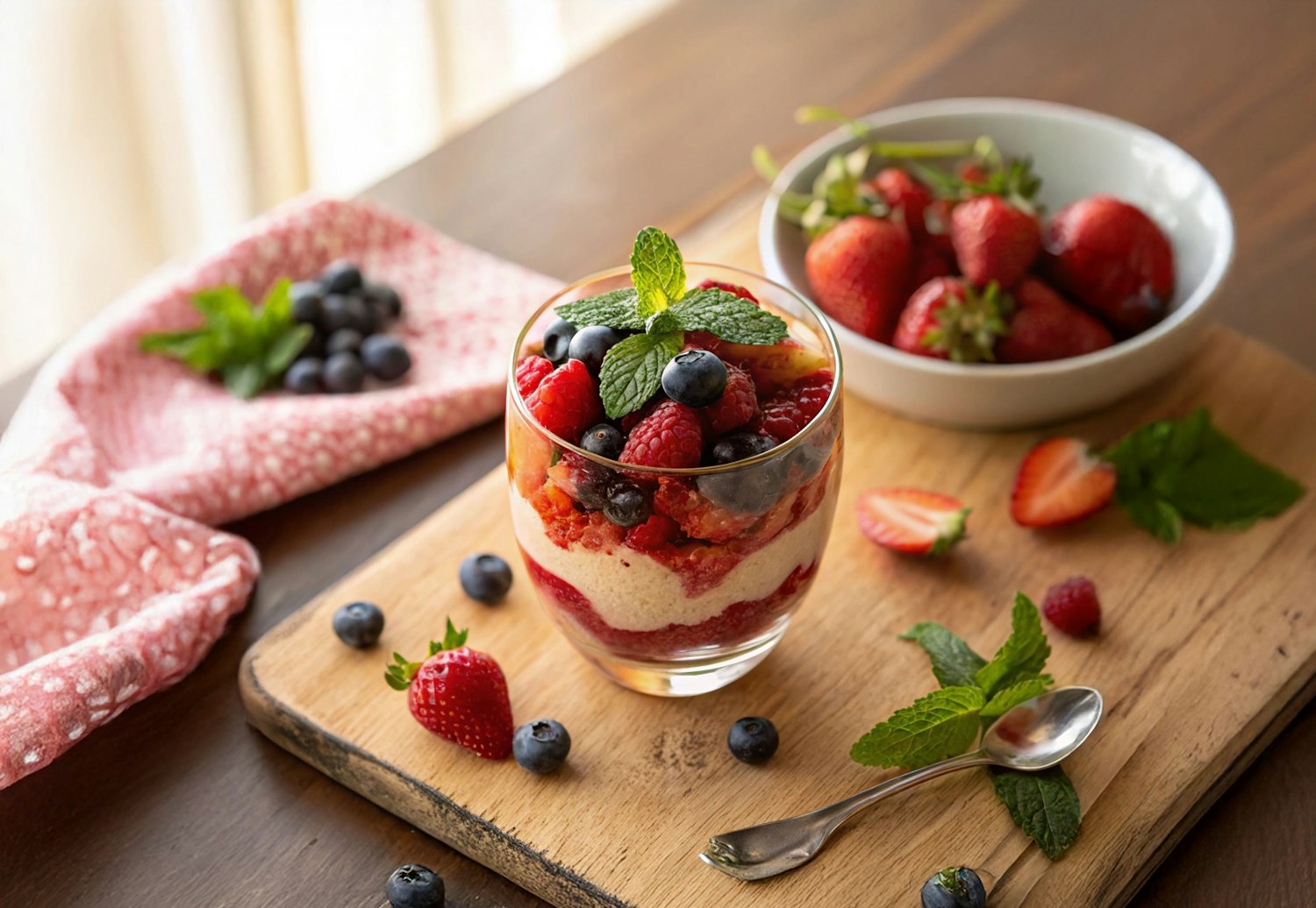 A delicious layered dessert with fresh berries and mint, served on a wooden board with a rustic and inviting presentation.
