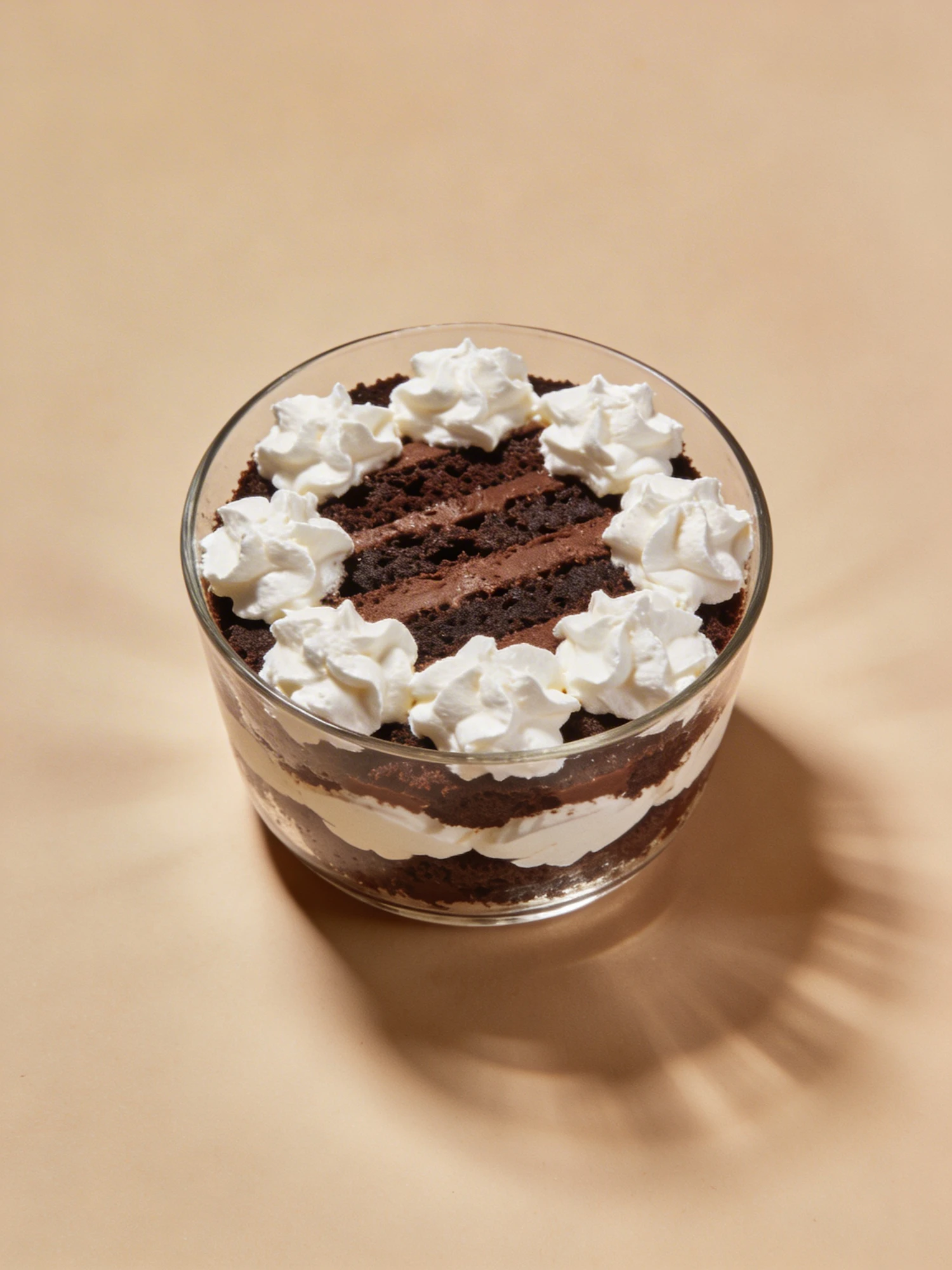 A layered chocolate trifle in a glass cup with whipped cream and chocolate cake, beautifully presented on a beige background.