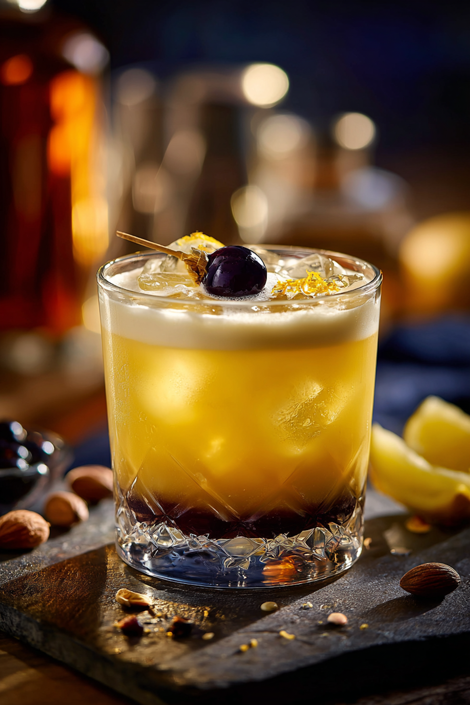 A vibrant cocktail with a frothy top, garnished with a cherry and zest, served in a textured glass on a slate surface.