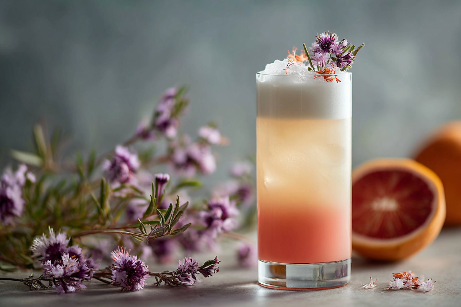 A beautifully layered cocktail with frothy foam, garnished with purple flowers, surrounded by fresh blooms and a halved blood orange.
