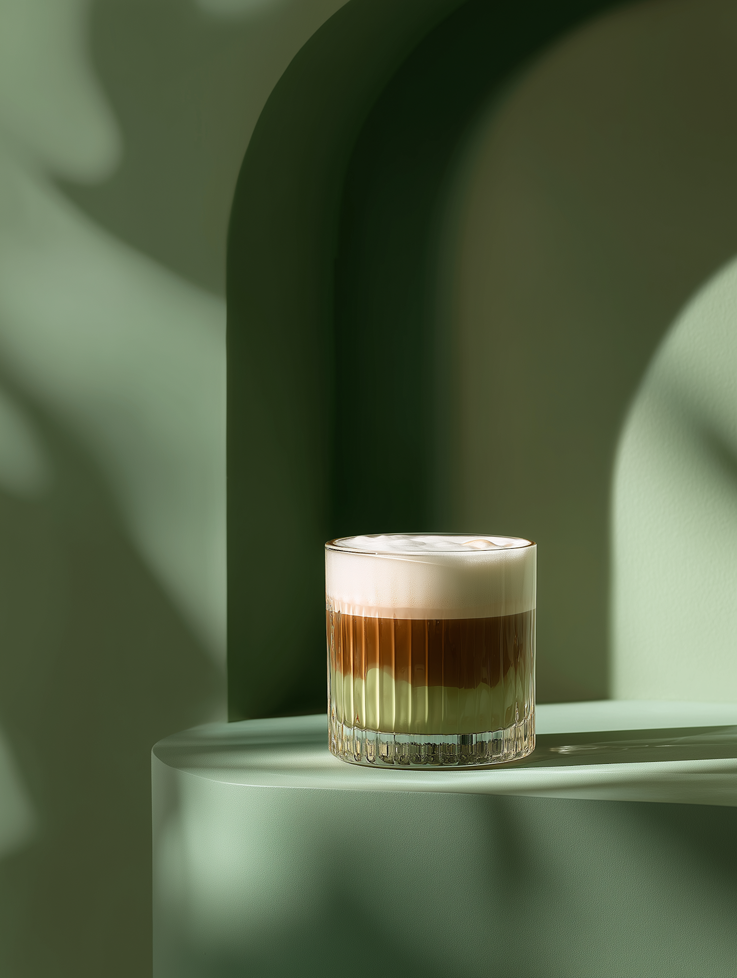 A beautifully layered coffee in a textured glass, set against a soft green background with elegant lighting and shadows.