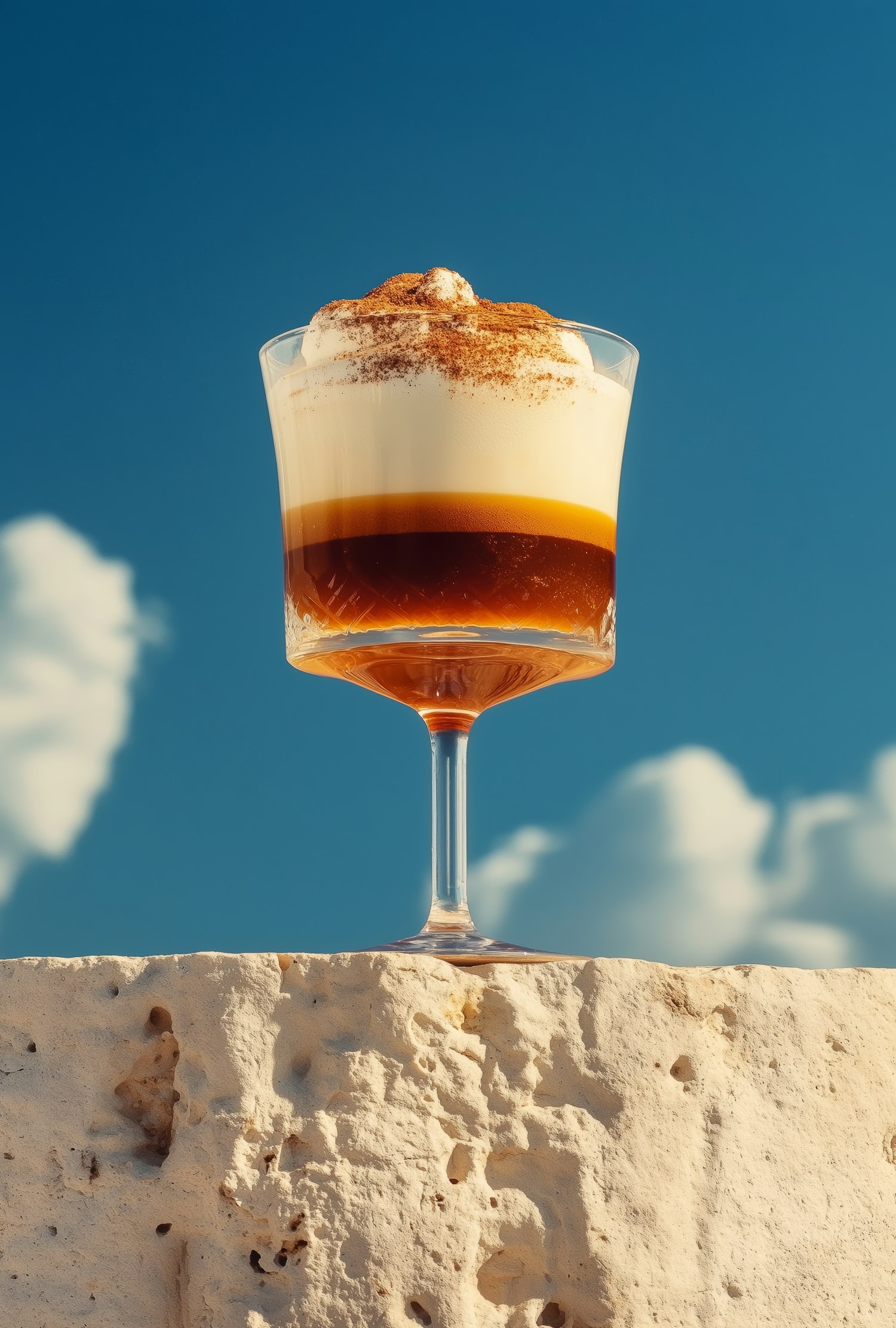 A layered coffee dessert in a glass, set against a blue sky with clouds, showcasing its creamy and frothy textures on a stone surface.