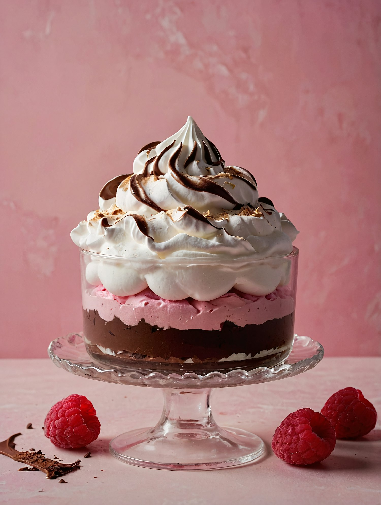A layered dessert with chocolate, pink mousse, whipped cream, and chocolate drizzle, garnished with raspberries on a pink background.