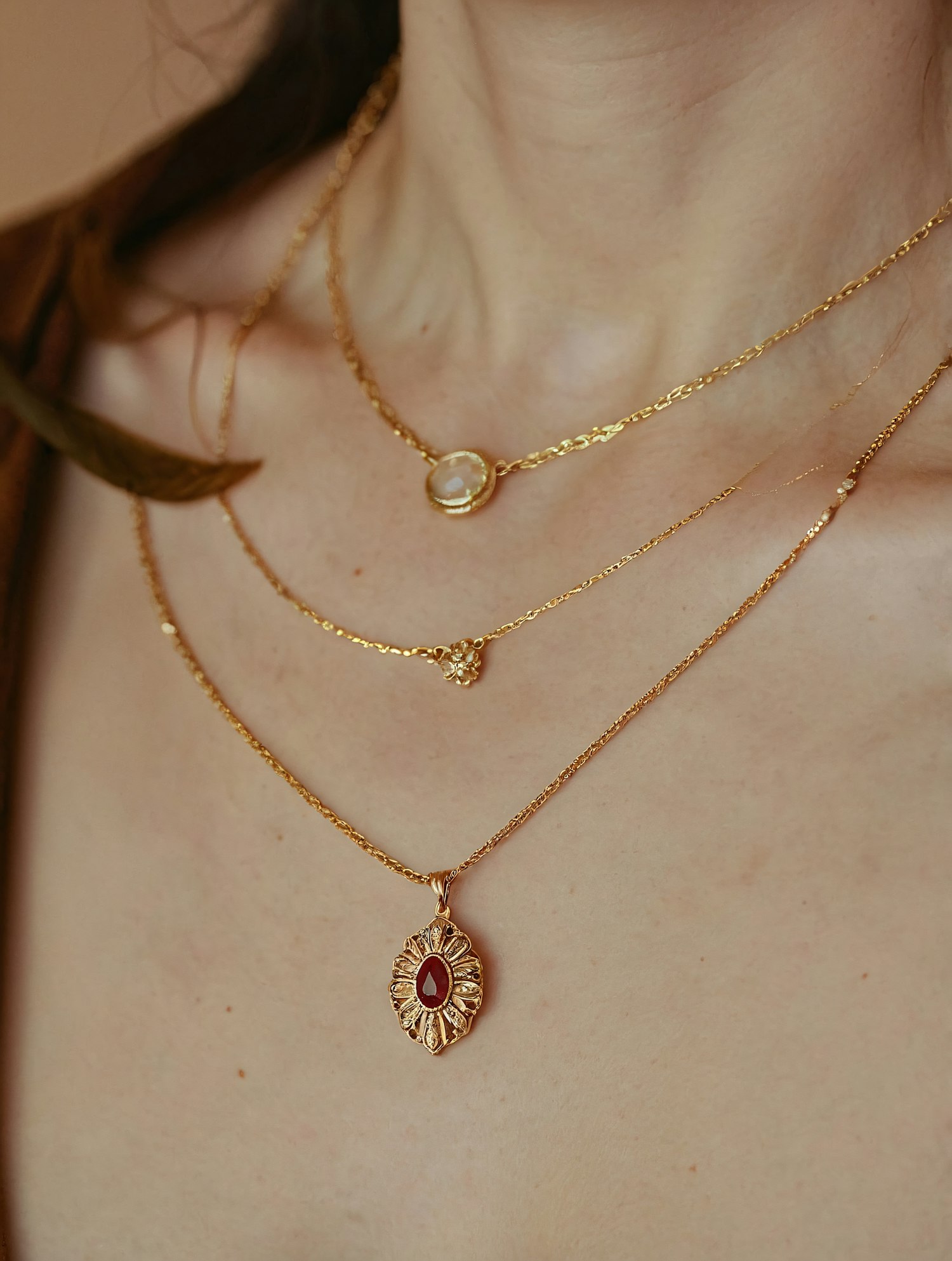 Elegant layered gold necklaces with white and red gemstone pendants on a woman's neck, showcasing intricate designs.