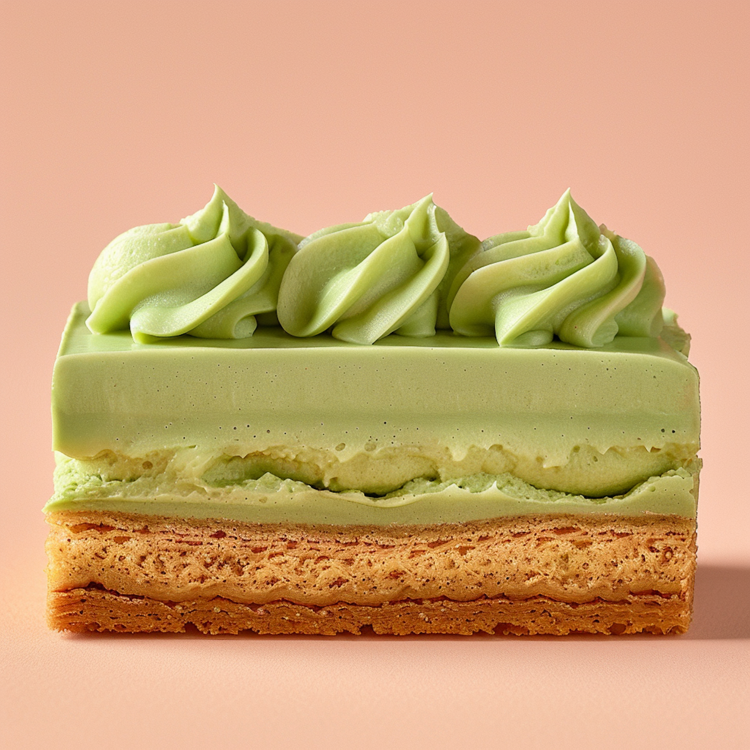 Elegant green dessert with layers of creamy filling and decorative frosting swirls on a crispy pastry base.