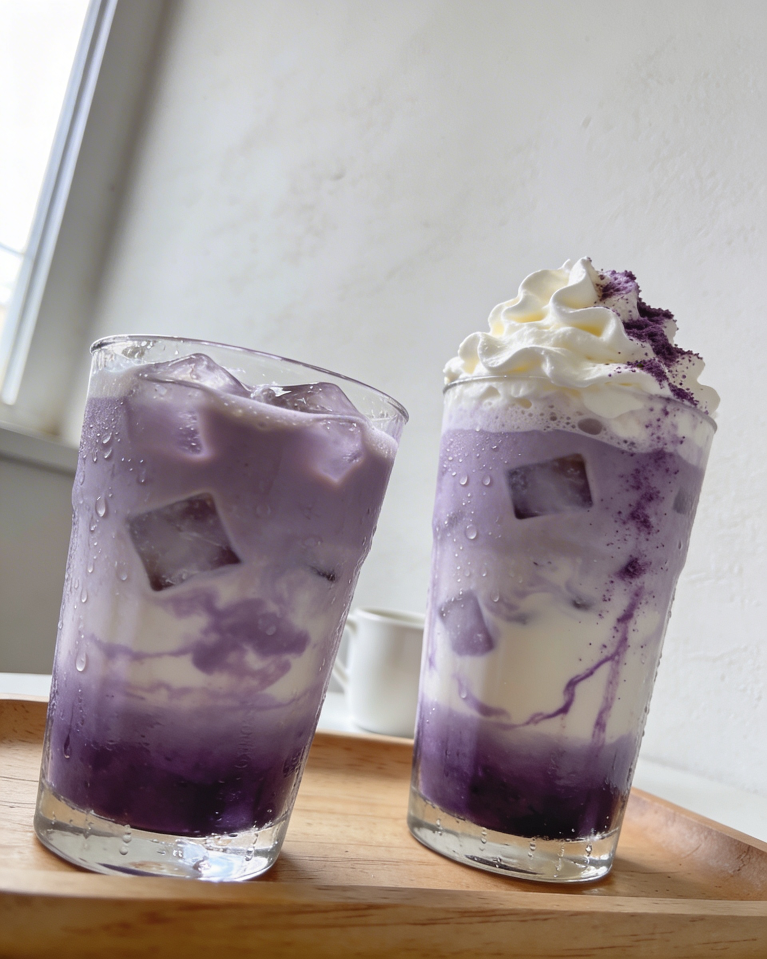 Natural lifestyle phone photography of two iced ube lattes served in clear straight glass tumblers placed on a light warm wood tray. The glasses are slightly wet with condensation, showing realistic cold drink texture. Inside each glass, a layered ube latte with a soft lavender-purple gradient: dense purple ube mixture at the bottom slowly blending into cold milk, creating organic cloudy marbling and imperfect diffusion. Visible ice cubes distorted through the glass, with natural refraction. On top, a thick soft layer of slightly melted whipped cream with irregular peaks and airy texture, finished with a delicate dusting of fine purple ube powder resting unevenly across one side of the foam. The liquid must look real and imperfect, with subtle streaks where the ube mixes with the milk, not perfectly blended, creating soft watercolor-like transitions. Camera angle slightly above table height, casual smartphone perspective, natural window light coming from the left side, soft shadows, low contrast, cozy neutral aesthetic. One shorter glass positioned closer to the camera on the left, one taller glass slightly behind on the right, both angled naturally as if placed casually. Background is a plain off-white wall with minimal texture, and a simple white ceramic cup blurred in the background for depth. Focus on hyper realistic beverage rendering: creamy density visible in the foam, semi-translucent lavender tones inside the drink, subtle reflections on the rim of the glass, authentic café atmosphere, imperfect handmade feeling, natural color palette, candid everyday photography look.